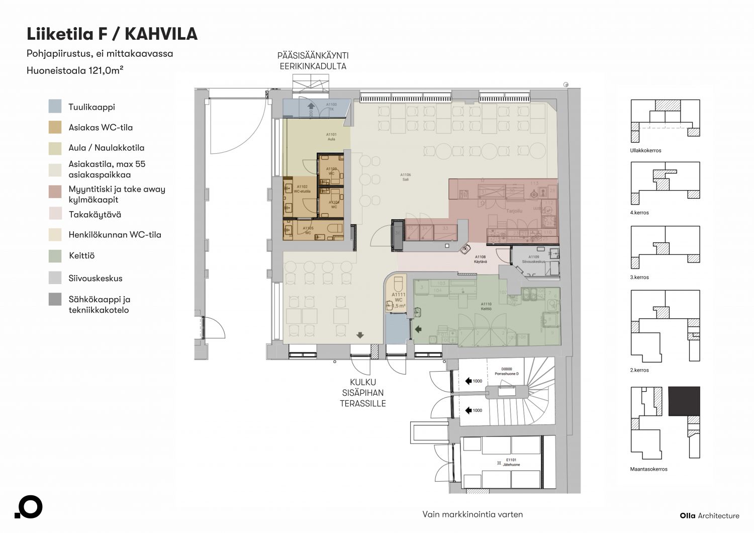 121 m² tila sijaitsee katutasossa ja tarjoaa paikan jopa 55 asiakkaalle. Lisäksi sisäpihalle on mahdollista toteuttaa n. 15-paikkainen terassi, joka luo viihtyisän kesäisen lisäalueen asiakkaille.