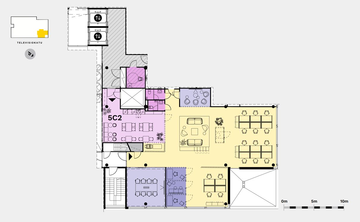 Viidennen kerroksen noin 312 m²:n moderni ja joustava monitoimitila tarjoaa erinomaiset puitteet liiketoiminnalle. Suuret ikkunat tulvivat tilaan luonnonvaloa ja luovat inspiroivan työympäristön. Tila on täysin muokattavissa käyttäjän tarpeiden mukaan. Nykyisessä pohjaratkaisussa on kahdeksan studio-/editointihuonetta: täydellinen ratkaisu esimerkiksi mediatuotantoyhtiölle tai luovan alan toimijalle. Lisäksi tila voidaan yhdistää viereiseen 437 m²:n kokonaisuuteen, mikä mahdollistaa entistä laajemmat tilaratkaisut.