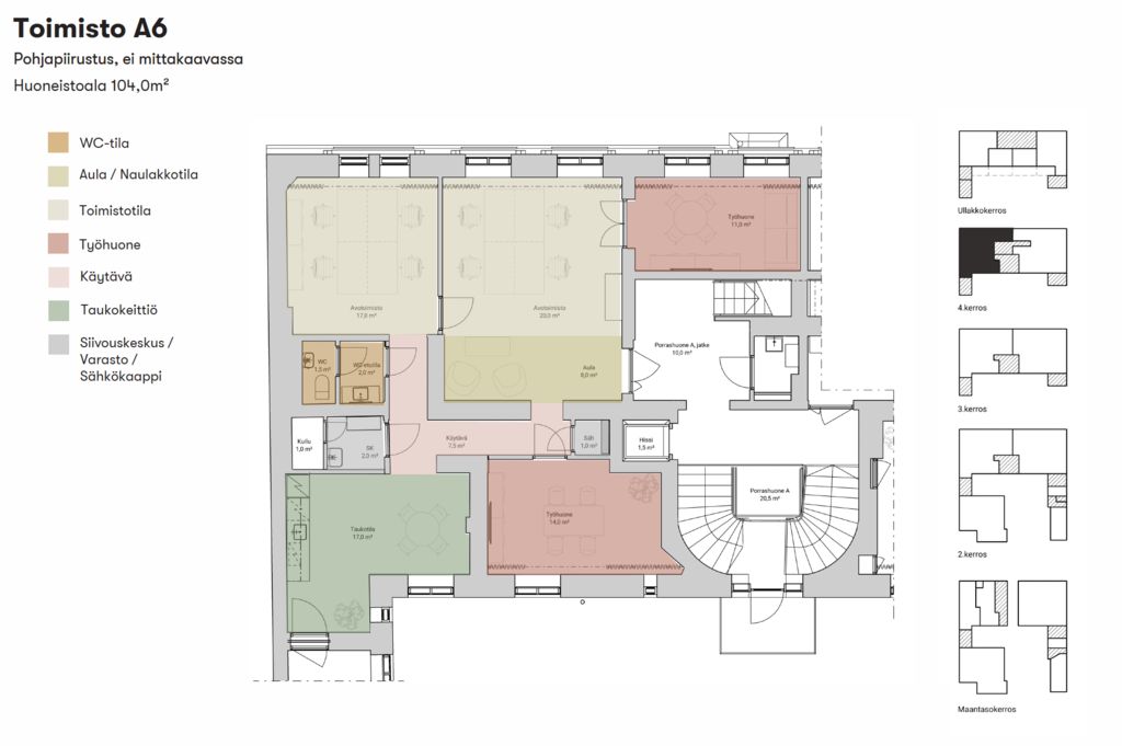 Tämä 104 m² toimistotila sijaitsee kiinteistön 4. kerroksessa. Toimistossa on avotilaa, muutama työhuone sekä omat keittiö- ja wc-tilat. Toimistossa on tyylikäs parkettilattia. Painovoimainen ilmanvaihto.