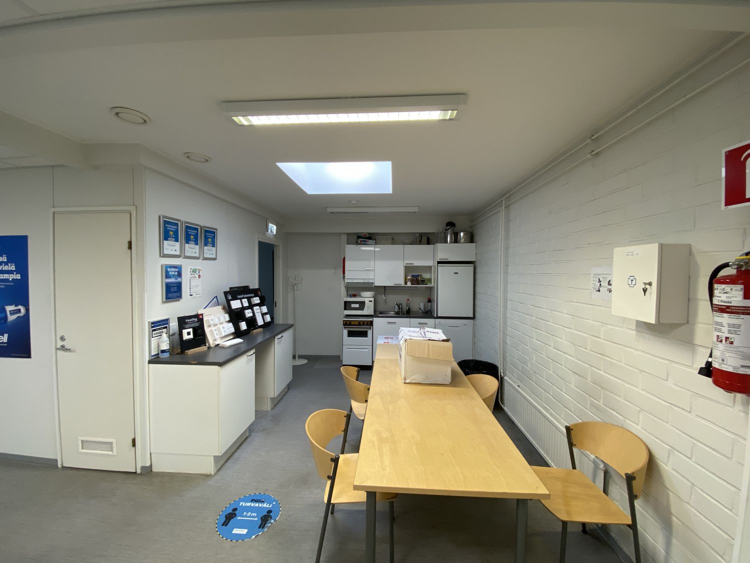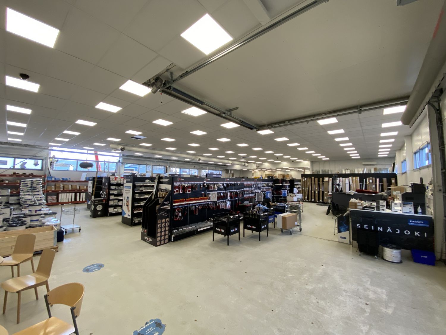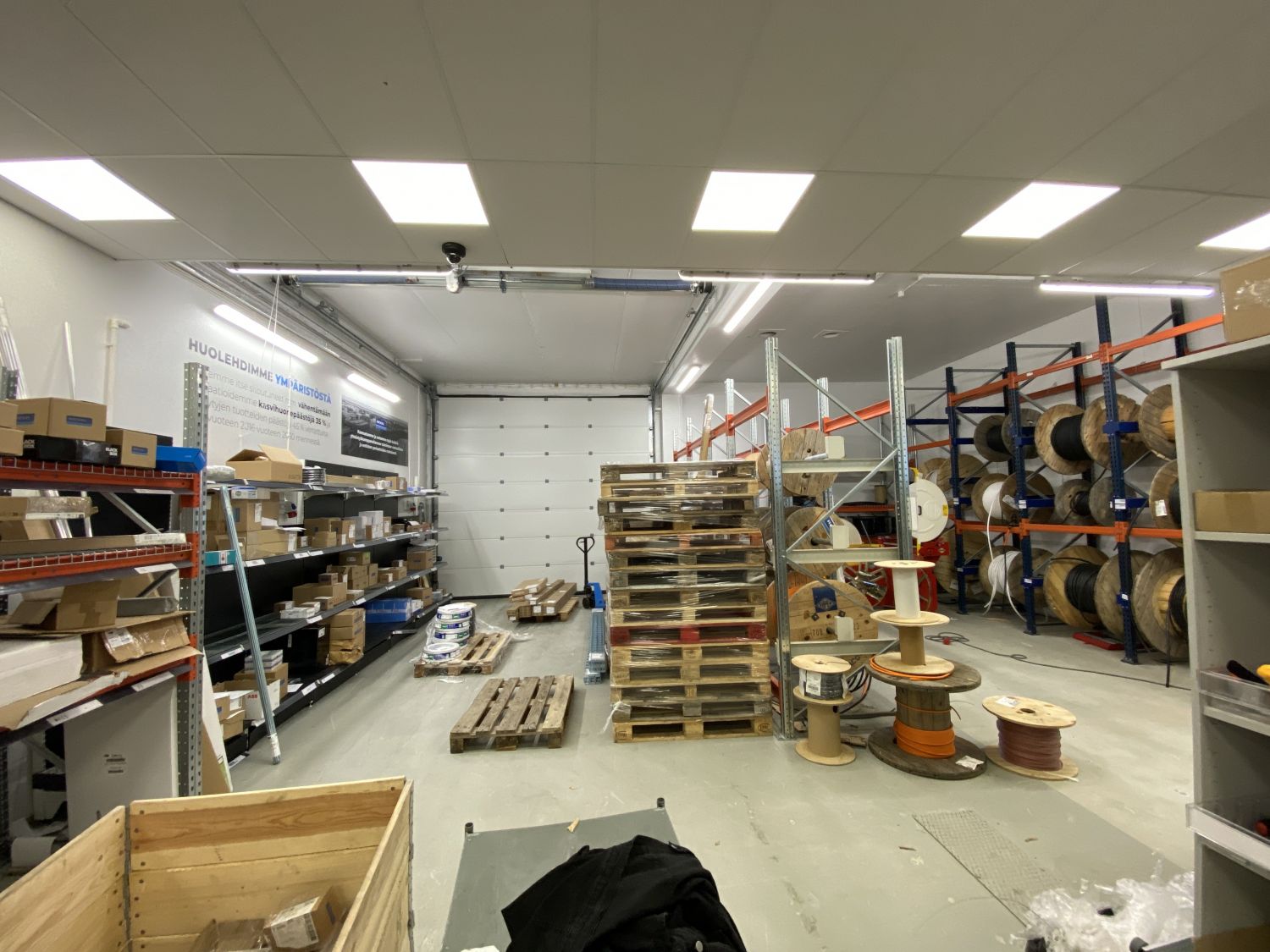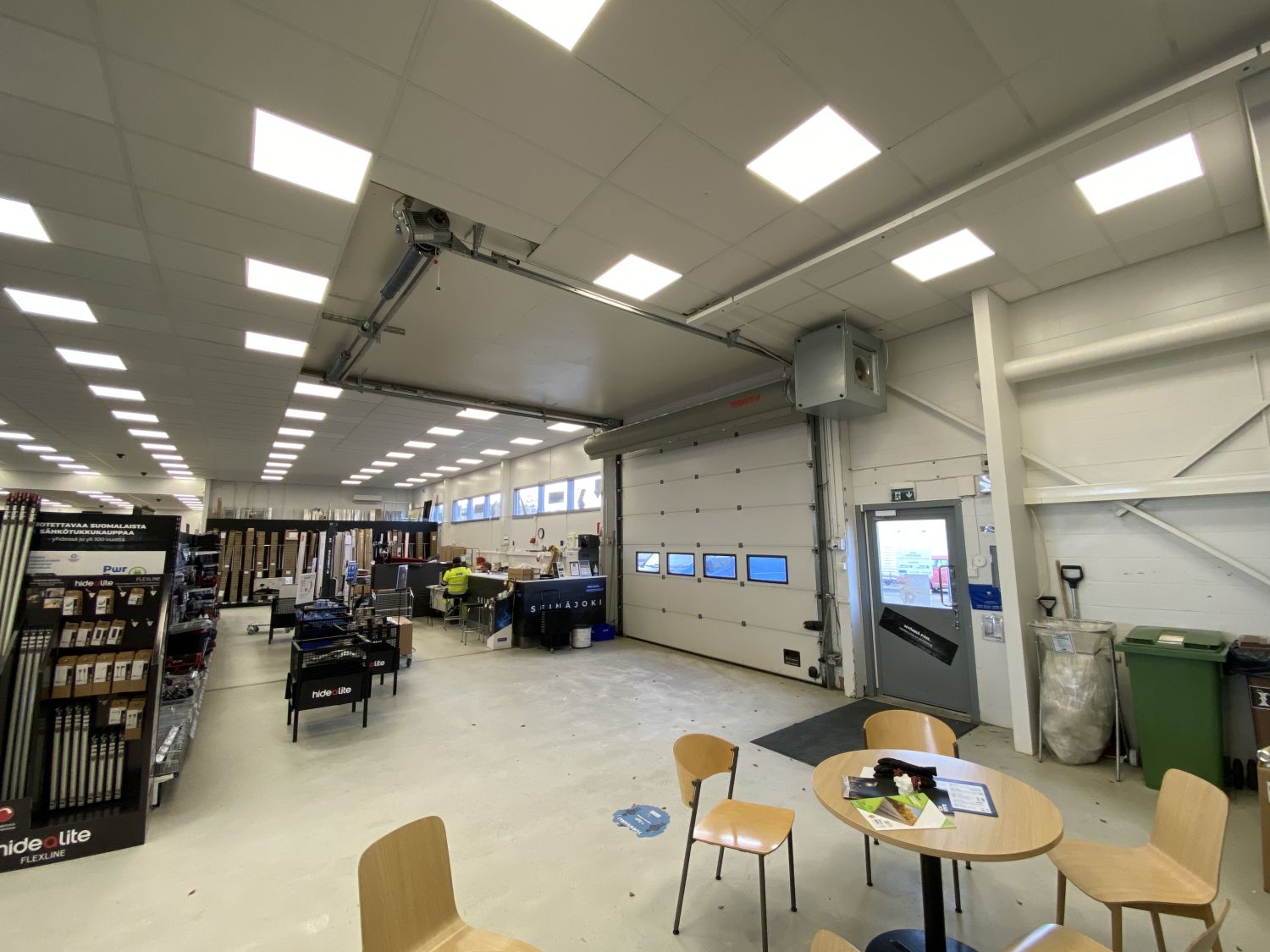 Sisäkorkeus yli 4 metriä. Tässä tilassa on kaksi nosto-ovea (4x4m) ja käyntiovi. Koneellinen ilmanvaihto ja viilennys ilmalämpöpumpulla. Asfaltoitu piha. Myymälässä alaslaskettu katto ja led-paneelivalaistus.