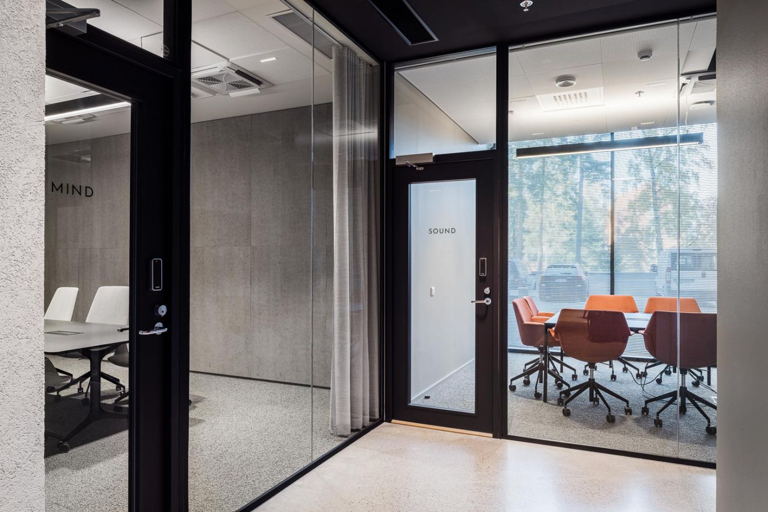 Aidot materiaalit, graafinen betoni ja corten-teräs yhdistettynä vehreään sisustukseen