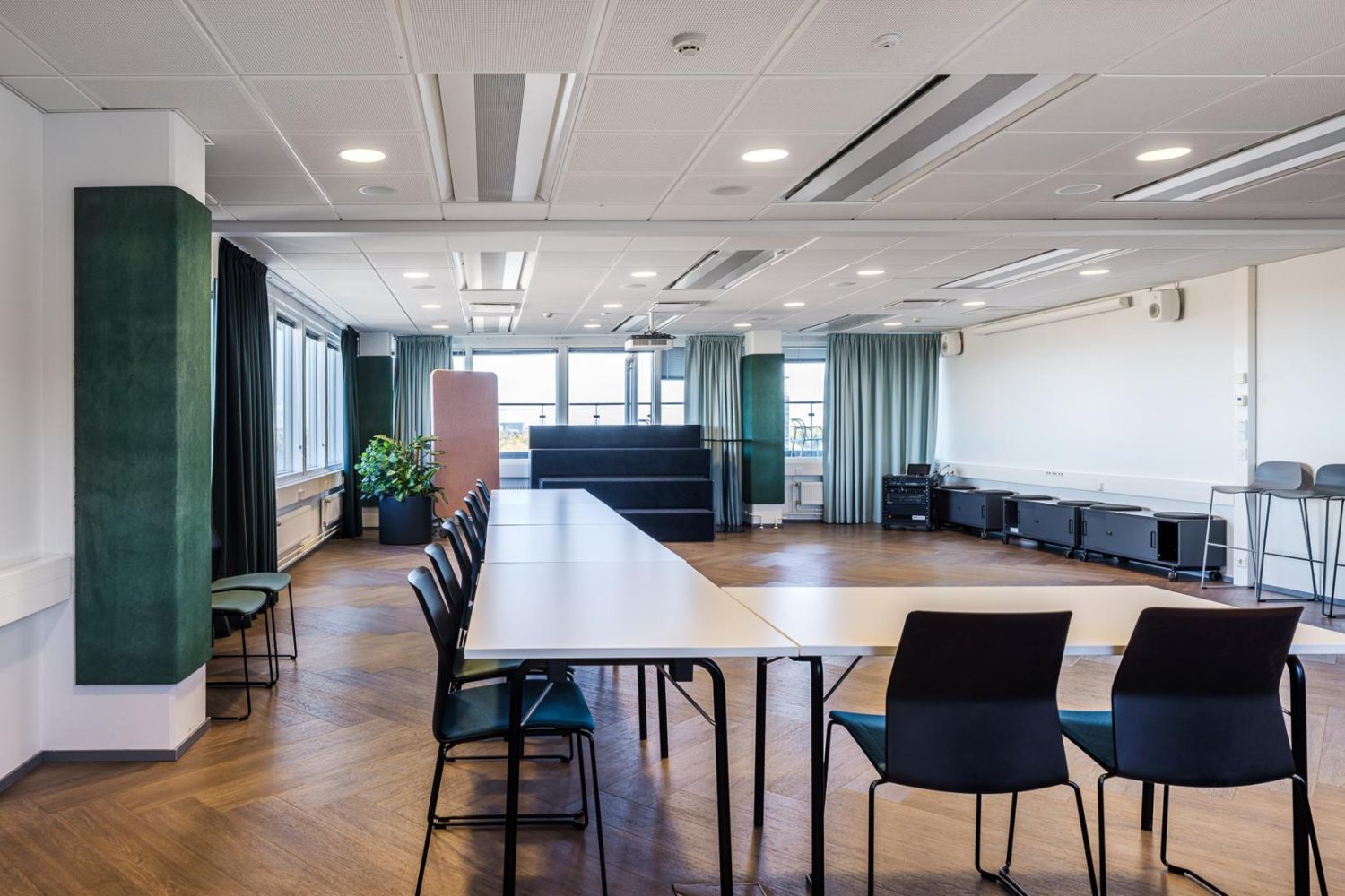 Ylimmän kerroksen muunneltavat tilat valmennuksiin ja tapahtumiin, suora yhteys kattoterassille