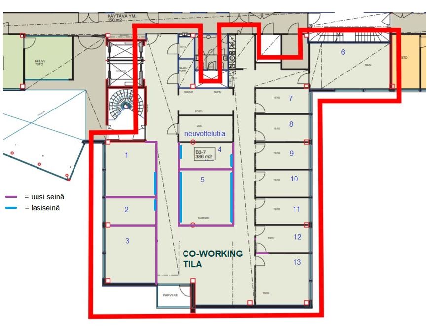 Vuokrattavana 3. kerroksen erikokoisia moderneja toimistohuoneita toimistohotellista.
