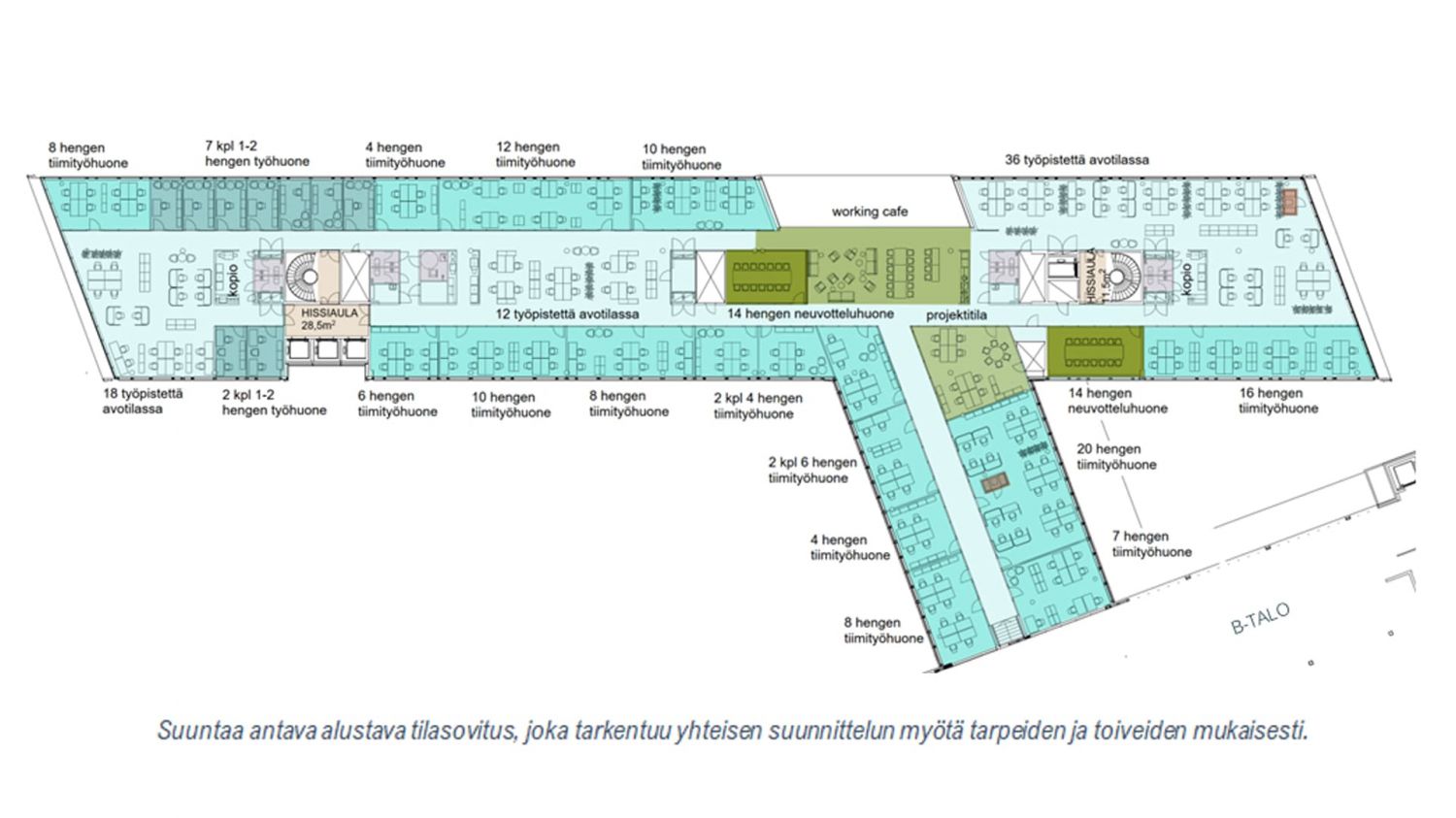 Työtilat noin 205 hengelle: