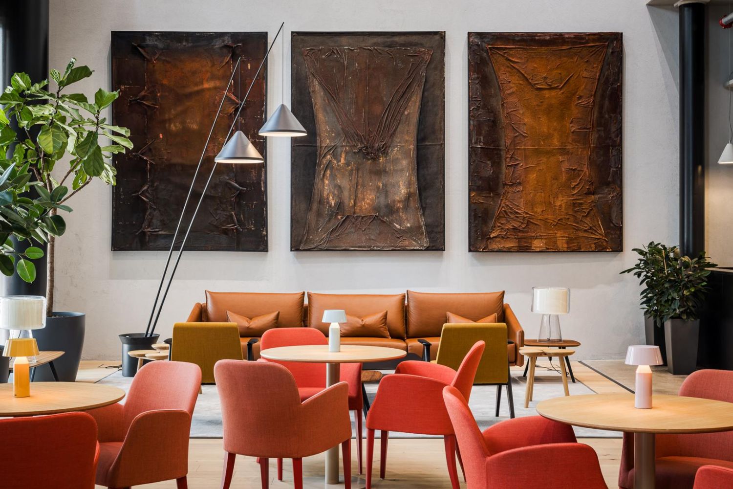 Aidot materiaalit, graafinen betoni ja corten-teräs yhdistettynä vehreään sisustukseen