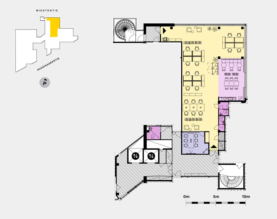 Tehokkaasti suunniteltu toimistotila sijaitsee 3. kerroksessa ja tarjoaa toimivan ympäristön sekä keskittyneeseen työskentelyyn että tiimityöhön. Tilassa on neuvotteluhuone, yhden hengen palaveri- tai puhelinhuone sekä avotilaa noin 18 työpisteelle. Ikkunoista avautuvat näkymät Miestentielle ja merelle Kuusisaaren suuntaan, tuoden tilaan valoa ja avaruutta.