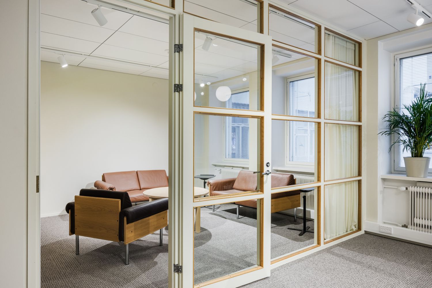 Sisään astuessasi huomaat heti tilan arvokkuuden. Korkeat huoneet, suuret ikkunat ja valo, joka tanssii vanhoilla listoituksilla, luovat tunnelman, jossa on helppo hengittää. Katse kiinnittyy yksityiskohtiin: entisöityihin kaappeihin, kauniisiin hyllykköihin ja ikkunoiden pieliin, jotka muistuttavat menneiden aikojen huolellisesta käsityöstä. Jokainen huone ja käytävä kantaa mukanaan muistoja keskustan vilinästä ja hiljaisista hetkistä, joissa ideoita syntyi ja yhteistyö kukoisti. Tämä ei ole vain toimistotila. Tämä on paikka, jossa historia elää nykypäivän arjen rinnalla.