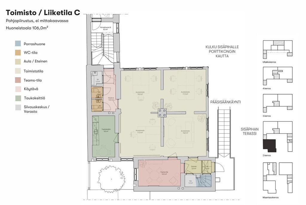 Talon sisäpihalle on rakennettu viihtyisä viherpiha, joka on talon vuokralaisten käytettävissä. Loistava sijainti Forumin ja Kampin keskuksen, sekä metroaseman läheisyydessä.