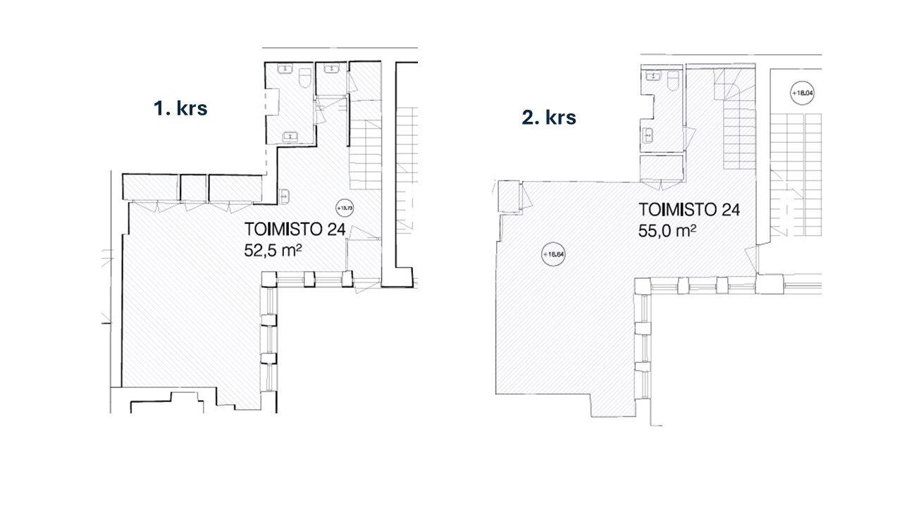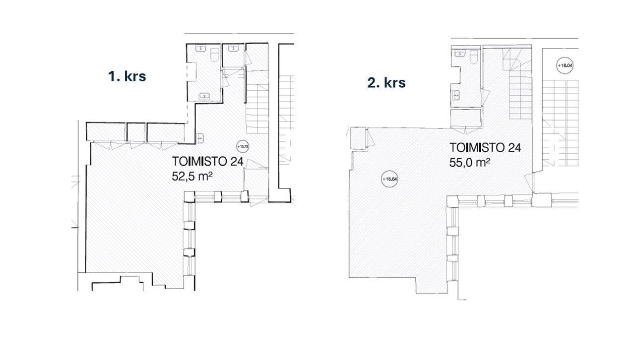 Sisäportailla yhdistetty kaksikerroksinen toimistotila omalla sisäänkäynnillä. Molemmat kerrokset ovat pohjaratkaisultaan avoimia. Tiloissa on omat wc:t, varasto, keittiö, koneellinen ilmanvaihto sekä erillinen jäähdytyslaitteisto. Toimitilan sisäänkäynti sijaitsee suojaisella ja saneeratulla sisäpihalla. Tila vapautuu 1.11.2024.