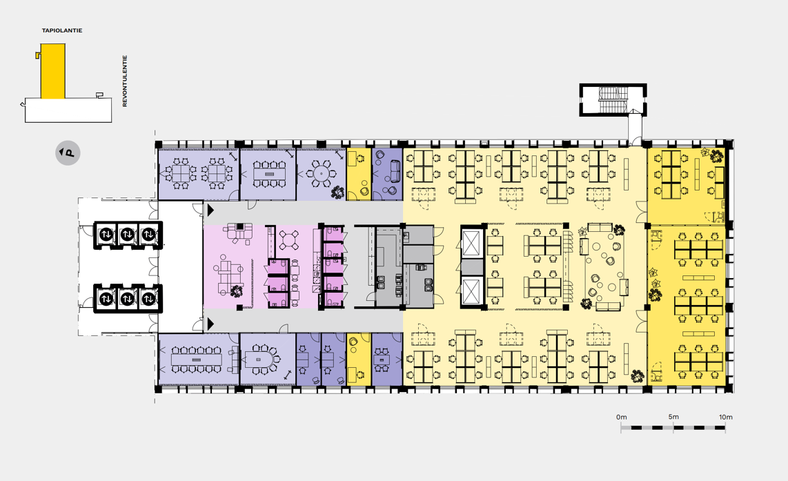Koko siiven kattava, näyttävä toimistotila tarjoaa tilaa jopa 88 työpisteelle ja inspiroivan ympäristön tehokkaaseen työskentelyyn. Ikkunat avautuvat kolmeen ilmansuuntaan, tuoden runsaasti luonnonvaloa ja avaruutta – ilman seinänaapureita tilassa vallitsee rauhallinen ja keskittynyt tunnelma. Tilassa on kuusi neuvotteluhuonetta, neljä vetäytymistilaa sekä tyylikäs cafe/lounge-alue, joka kutsuu kohtaamisiin ja taukohetkiin. Tämä kokonaisuus yhdistää toiminnallisuuden, viihtyisyyden ja edustavuuden ainutlaatuisella tavalla.