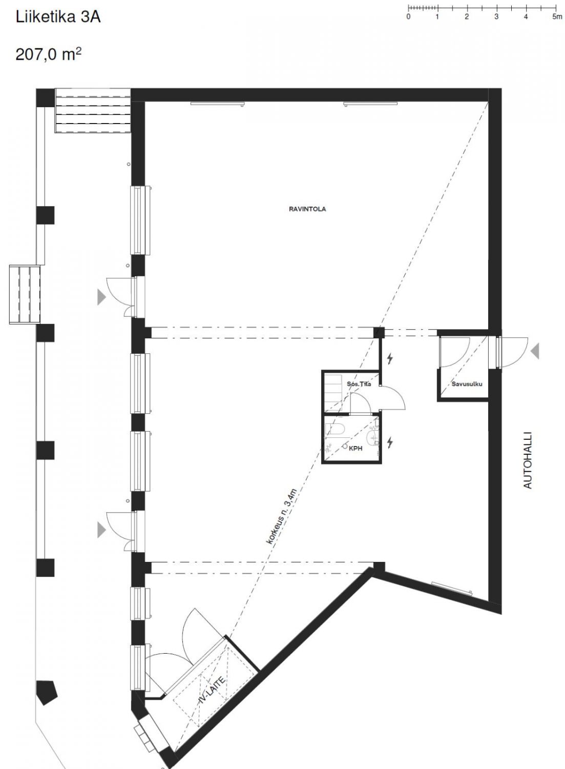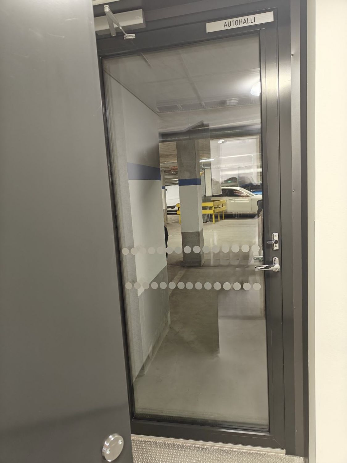 Tilaan on kaksi sisäänkäyntiä, pääsisäänkäynti kadulta sekä toinen käynti autohallista.