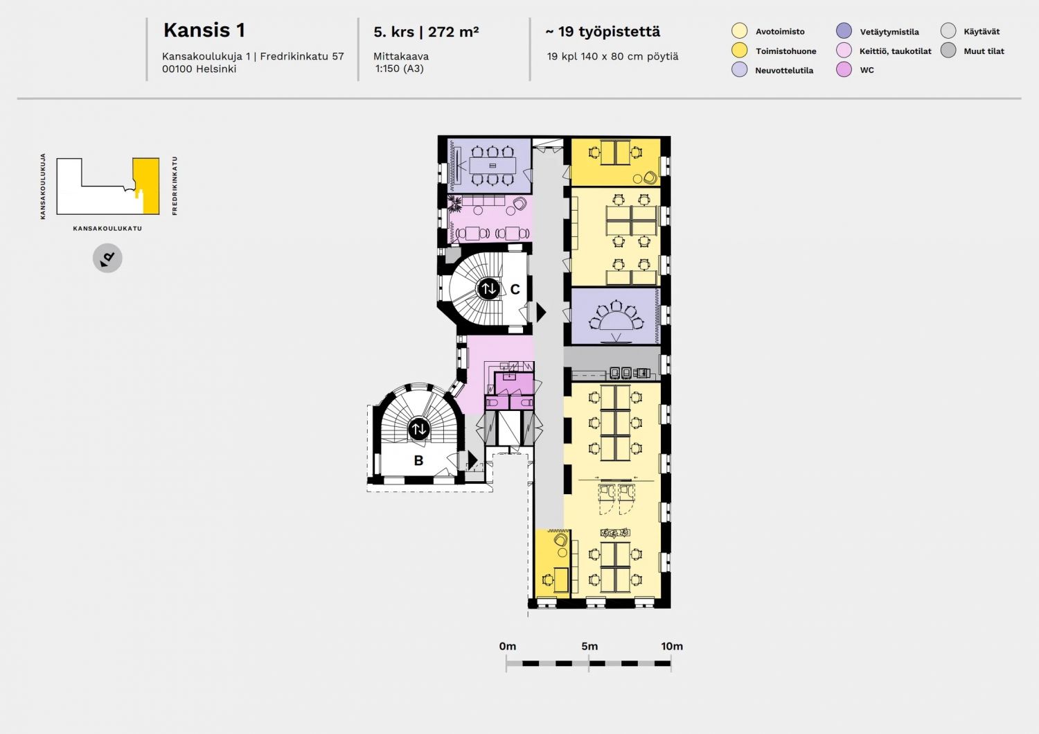 Viidennen kerroksen monimuotoinen toimisto, jossa on useita työhuoneita ja neuvottelutiloja.