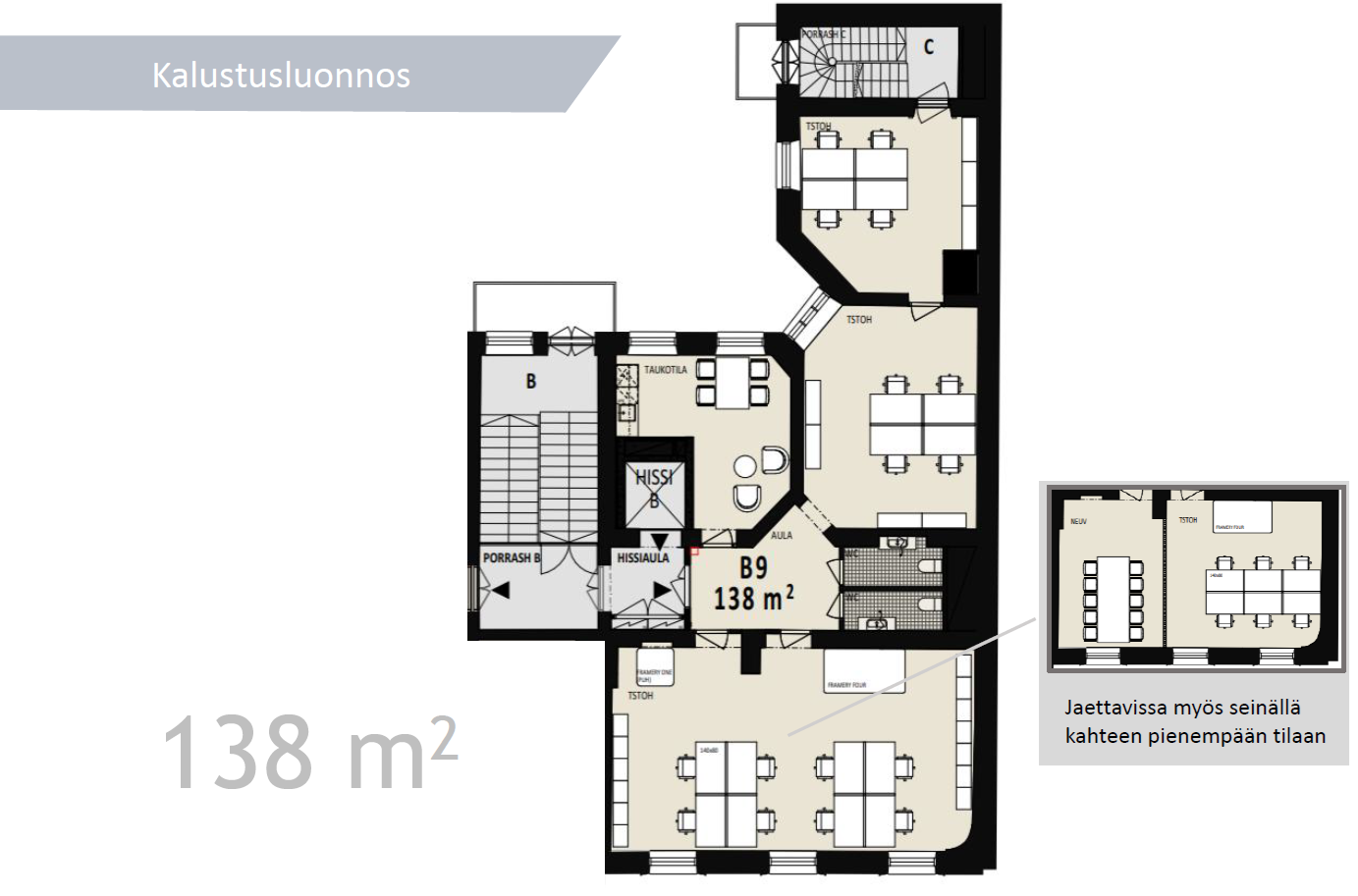 Rikhardinkatu 2:n ylimmässä kerroksessa sijaitseva 138 m² toimistotila tarjoaa edustavat ja toimivat puitteet vaativankin yrityksen tarpeisiin. Tilassa on kaksi itsenäistä toimistohuonetta, avara neuvotteluhuone, hyvin varusteltu keittiö sekä kaksi WC:tä. Valoisat ja korkeakattoiset huoneet huokuvat arvokkuutta ja rauhallisuutta, ja ne soveltuvat erinomaisesti esimerkiksi luovaan, asiantuntija- tai hallintotyöhön.