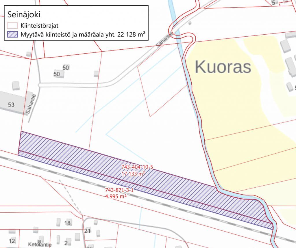 Myydään kiinteistö 743-404-10-5 sekä määräala kiinteistöstä 743-87-3-1, yhteispinta-alaltaan noin 22 128 m². Kohde sijaitsee noin 19 km Seinäjoen keskustasta kaakkoon, Kouran alueella. Alue sijaitsee radan pohjoispuolella ja rajautuu etelässä rautatiealueeseen, idässä Kuorasluomajokeen sekä muissa ilmansuunnissa naapurikiinteistöihin. Alue on pääosin metsittynyttä.