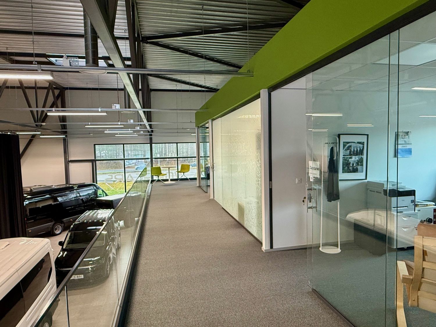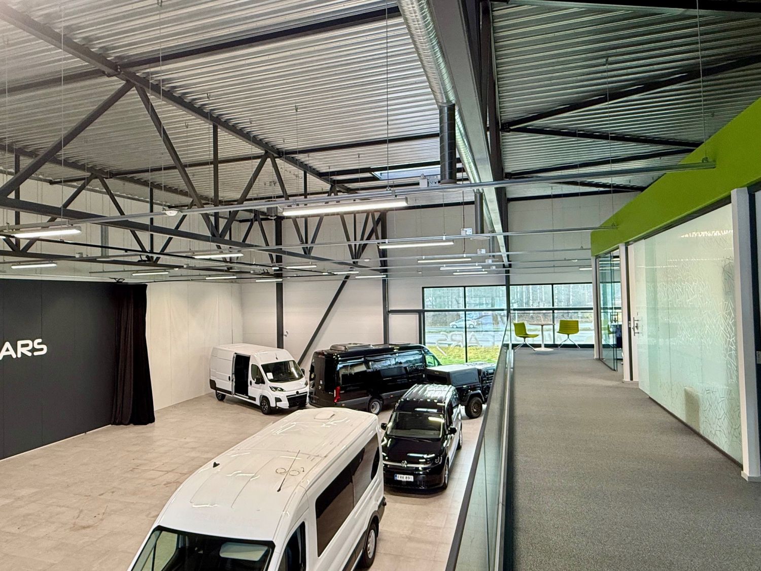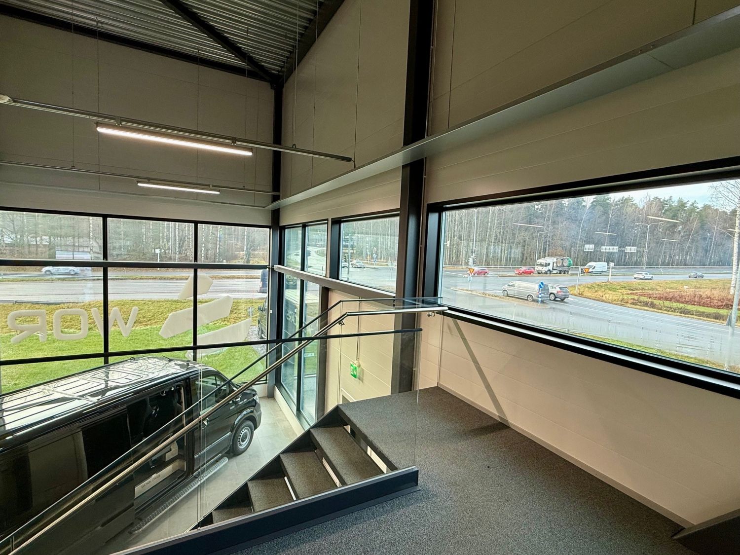 Korkea ja avara hallitila, jossa suuret ikkunat kahdella seinällä Vaasantien risteysalueelle.