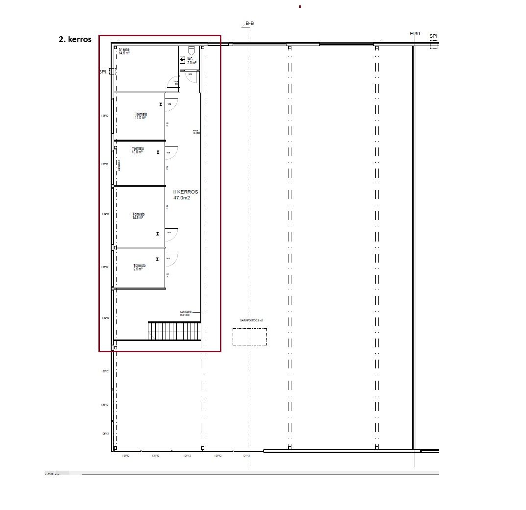 Tila on kooltaan n. 700 m2 josta n. 550m2 on hallitilaa ja loput kahteen kerrokseen sijoittuvaa toimisto-, sosiaali- ja varastointitilaa.