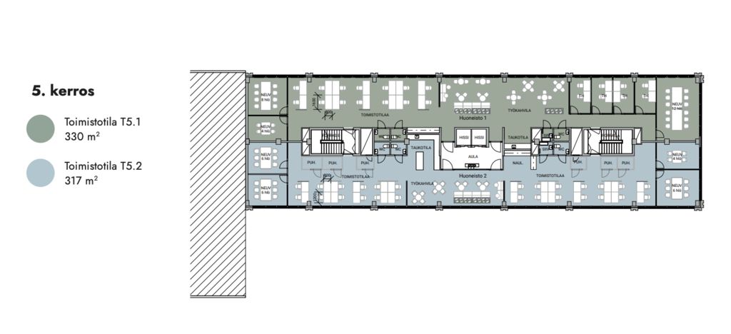 Tämä 330 m² toimistotila sijaitsee kiinteistön 5. kerroksessa.
