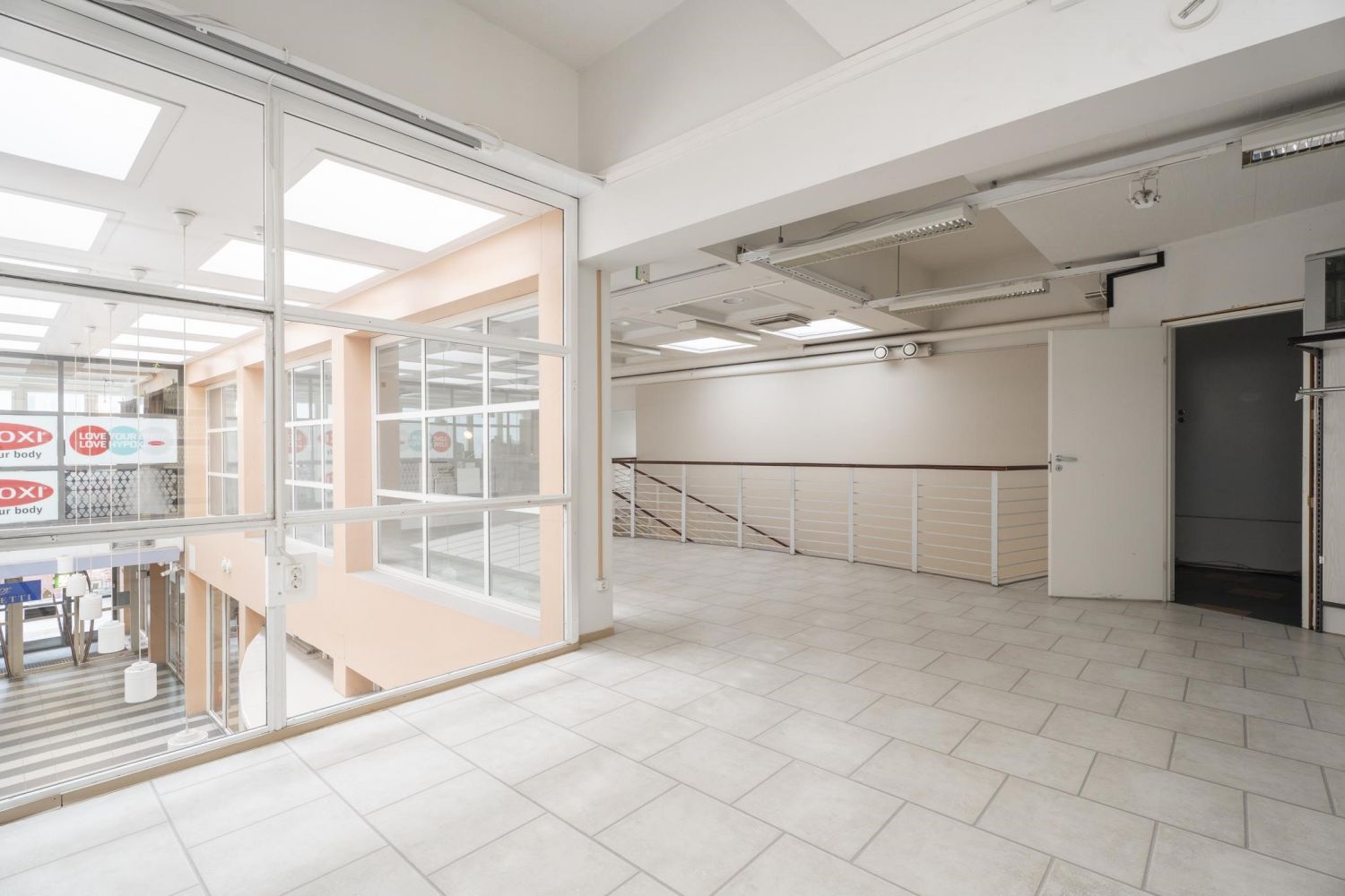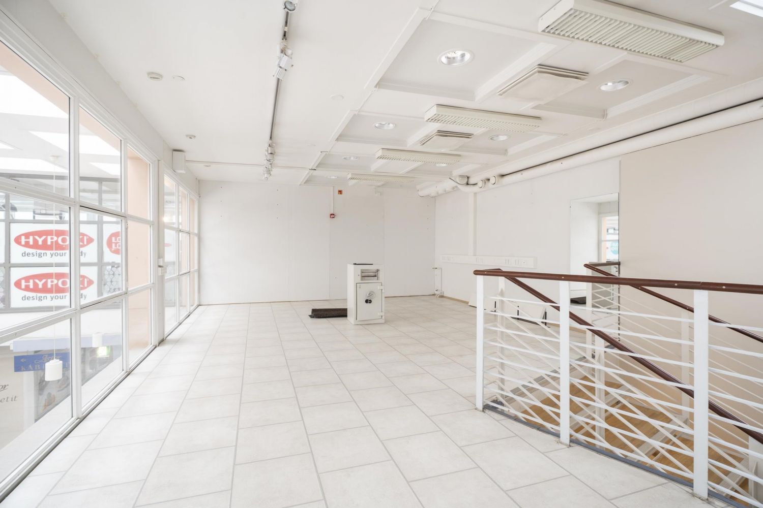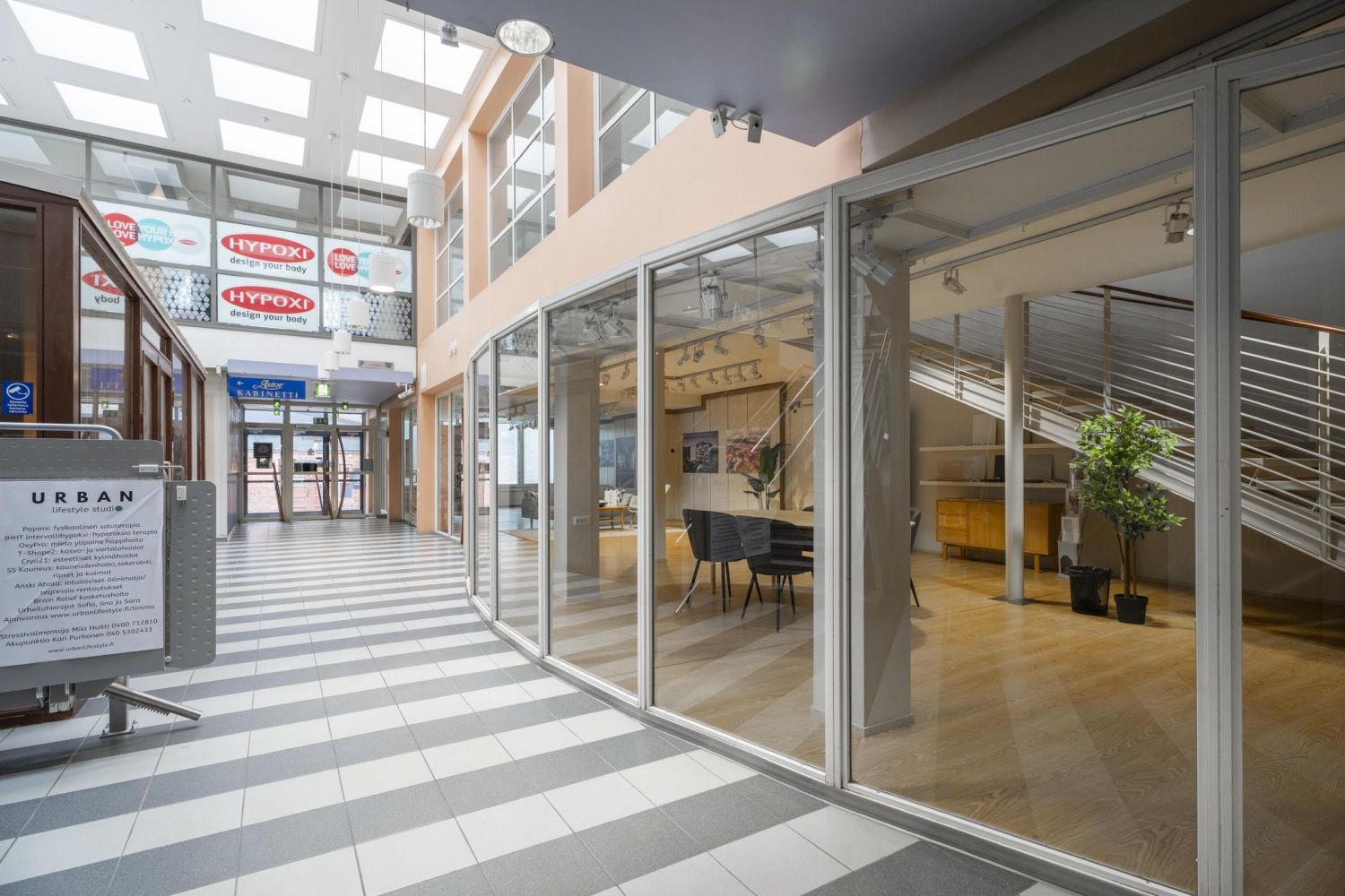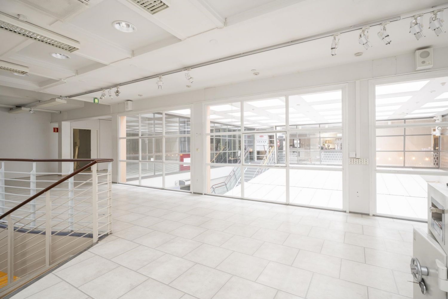 Liiketilan alakerta on avointa liiketilaa kauppakäytävän varrella, isot lasi-ikkunat koko käytävän mitalta. Kaarevat portaat johtavat yläkertaan jossa on yksi vessa.