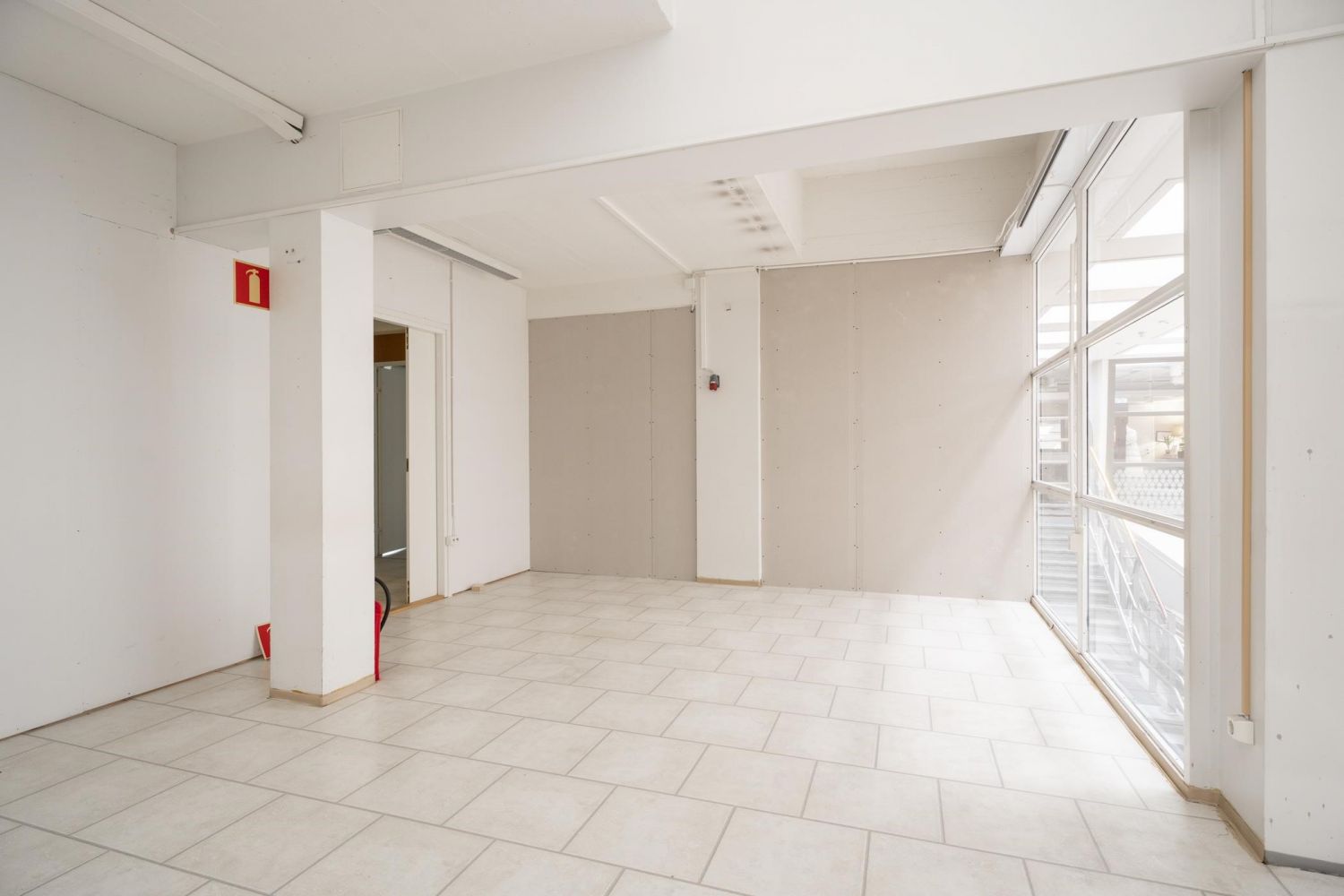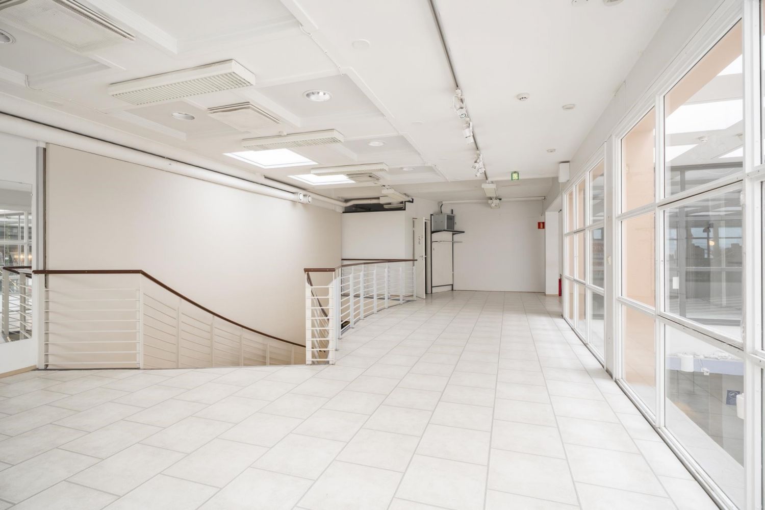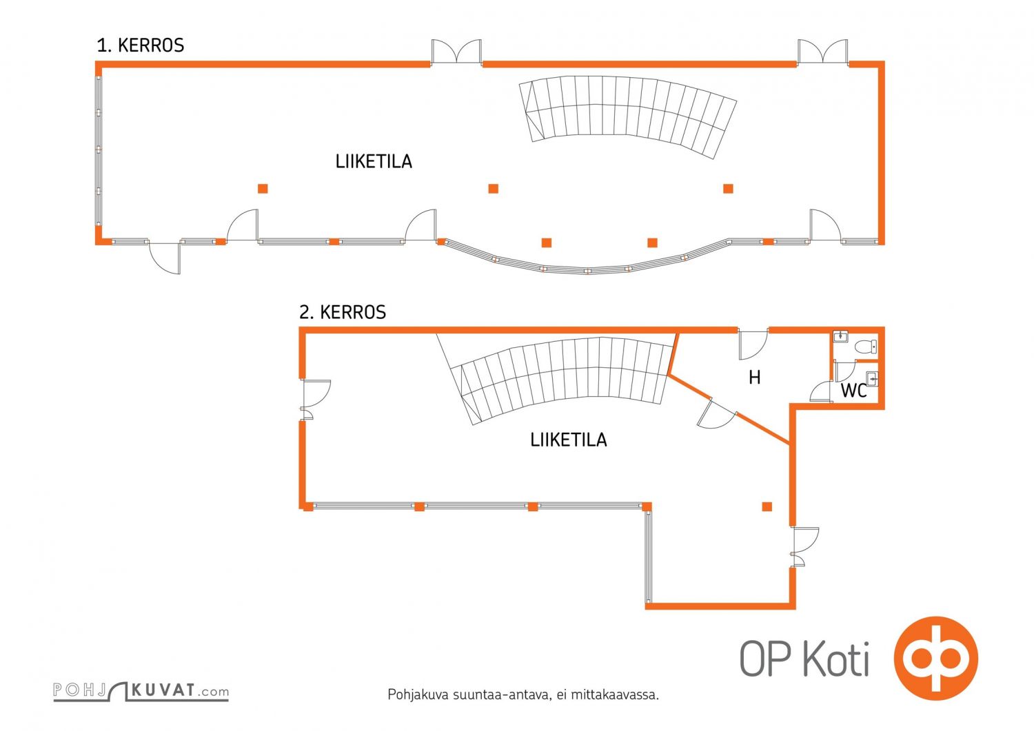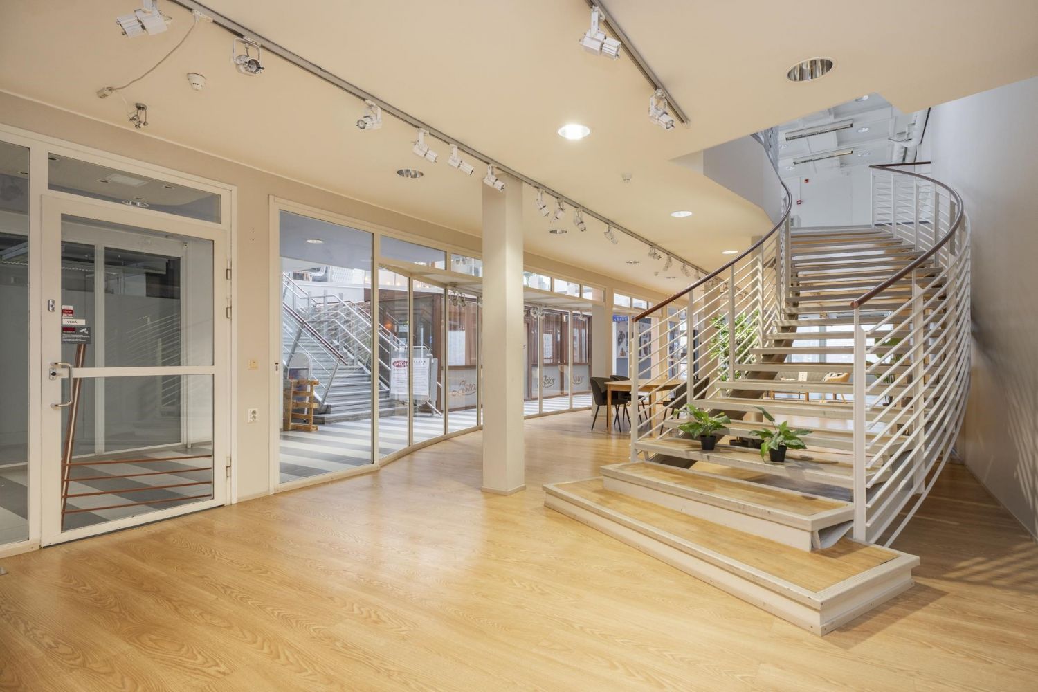 Liiketilan alakerta on avointa liiketilaa kauppakäytävän varrella, isot lasi-ikkunat koko käytävän mitalta. Kaarevat portaat johtavat yläkertaan jossa on yksi vessa.