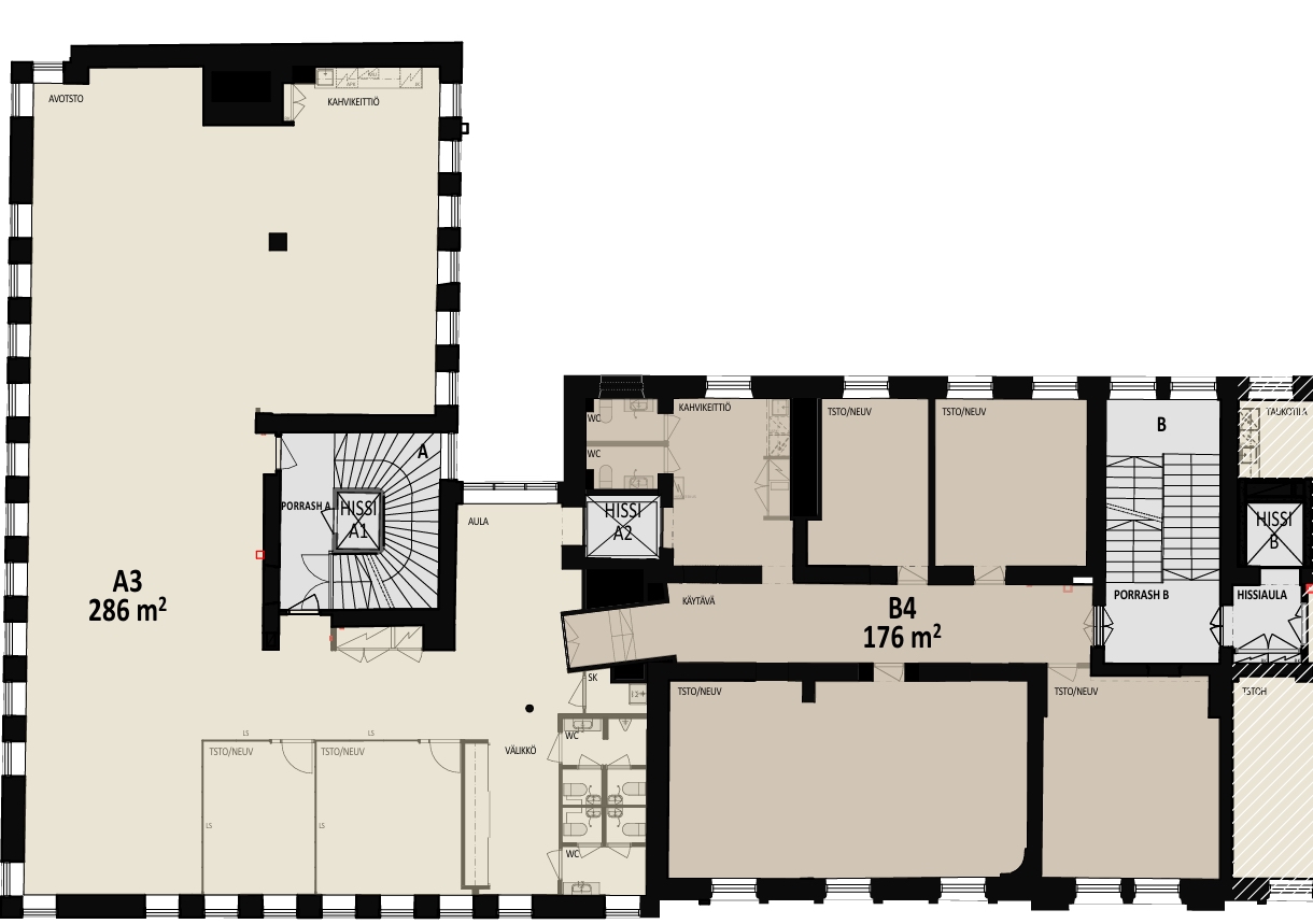 Kasarmikadun ja Rikhardinkadun kulmaan sijoittuva osuus huoneistosta on täysin modernisoitua avotoimistoa. Rikhardinkadun puoleinen osa sisältää edustavia tiimityötiloja