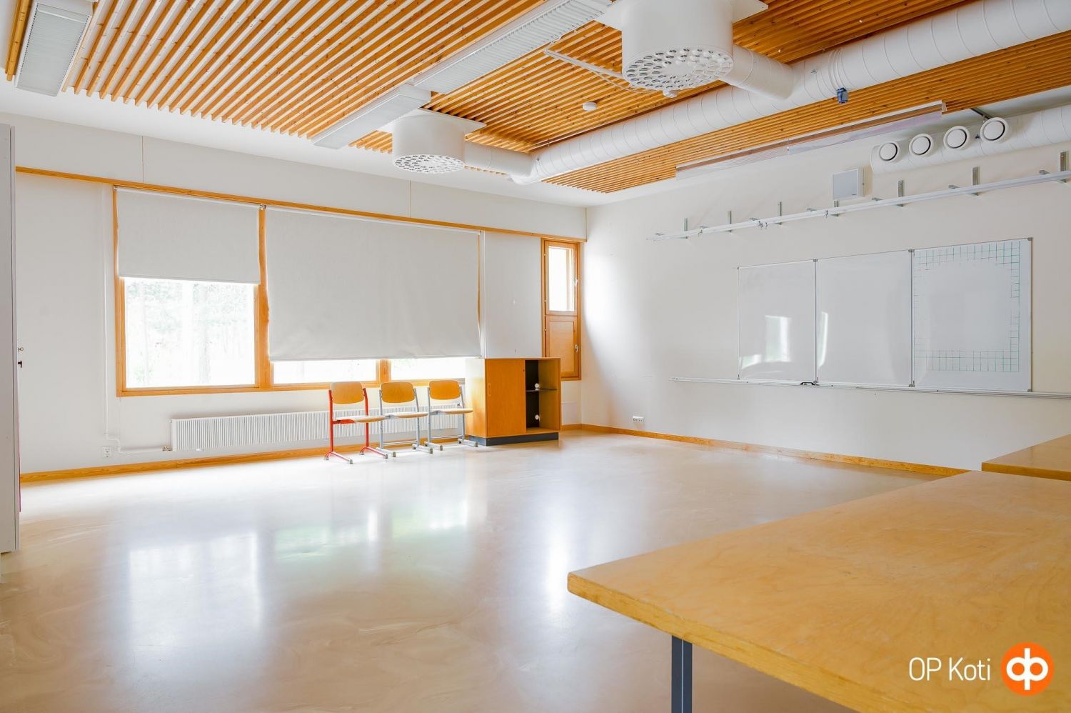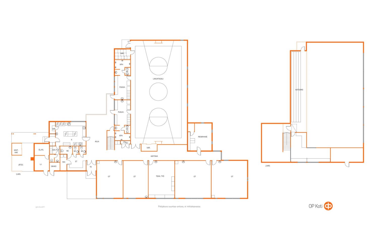 Tilojen tarkempi erittely: 5 luokkahuonetta, keittiö, aula/ruokasali, liikuntasali, 2 x pukuh., 2 x suihkutila, 5 x wc, väestönsuoja, sos. tila, varastotiloja, eteinen, tekniset tilat.