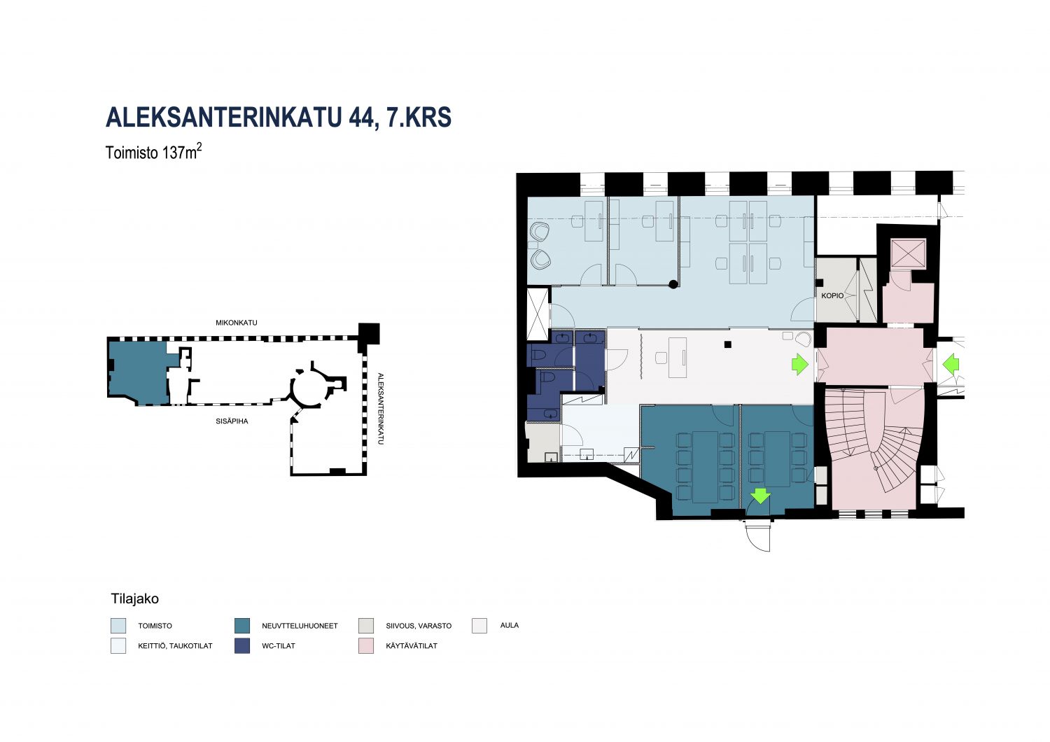 Aleksanterinkatu 44 on ainutlaatuinen toimintaympäristö yritykselle. Talon tyylin mukaisesti uusitut laadukkaat ja edustavat toimistotilat sijaitsevat 2.–7. kerroksessa. Toisen kerroksen Kansallissali on tunnettu juhla- ja kokouspaikka, ja se on säilytetty lähes alkuperäisessä asussaan.