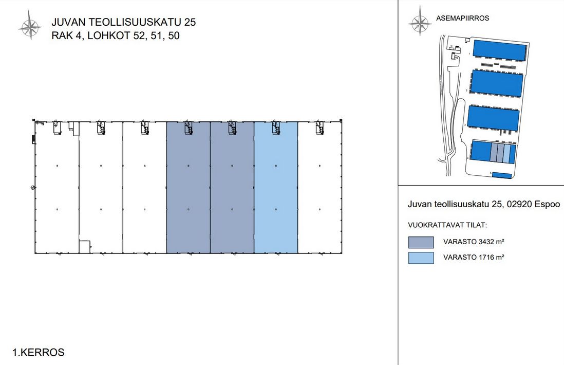 Vuokrataan varastotilaa rakennus 4, lohko 50. Nykyajan vaatimukset täyttävää logistiikkatilaa, vapaa korkeus n. 8,5 m. 2 nosto-ovea lastauslaiturille (lastauskorkeus), takaovi (3,9 m x 4,5 m) maantasossa, Lattiakantavuus 3 000 kg/m2,