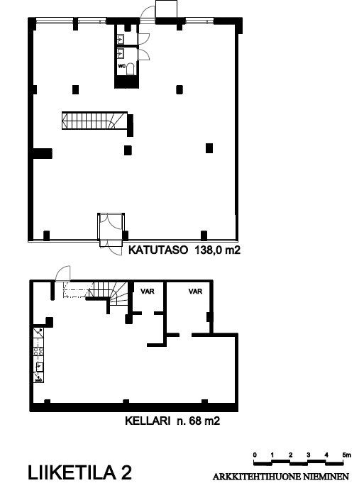 Katutason tilat soveltuvat esimerkiksi myymälä- tai asiakaspalvelutoimintaan, ja kellarikerros tarjoaa lisätilaa esimerkiksi varastointiin tai henkilökunnan käyttöön. Sisäänkäynti on suoraan kadulta.