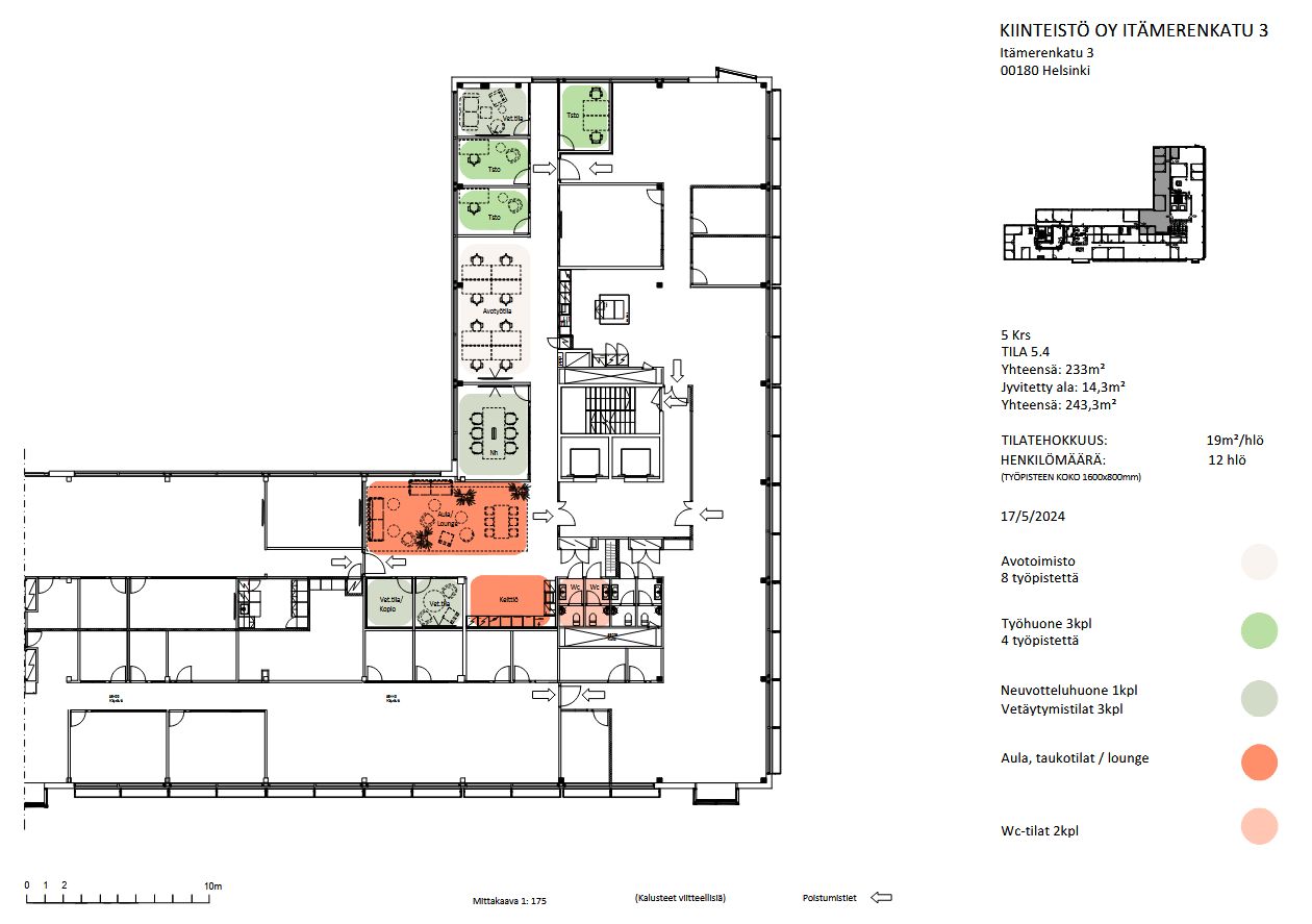 Vuokrataan upea Aina Valmis -konseptin mukainen toimisto 5. kerroksessa B-rapussa sisäpihalla. Tilan ikkunat ovat vehreän sisäpihan suuntaan. Tila sisältää: Keittiö-/sohvaloungen, neuvottelutilan, kaksi vetäytymistilaa, kolme toimistotilaa, varastotilan, kaksi wc:tä ja avotyöskentelytilan.