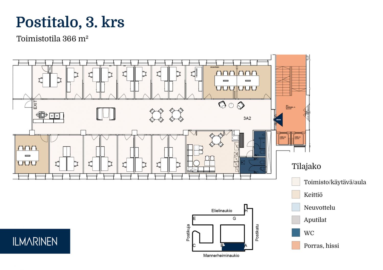 Ikkunat Mannerheiminaukiolle ja sisäpihalle. Yhdistettävissä 84,5 m2 kokoiseen tilaan, joka sijaitsee samassa kerroksessa.