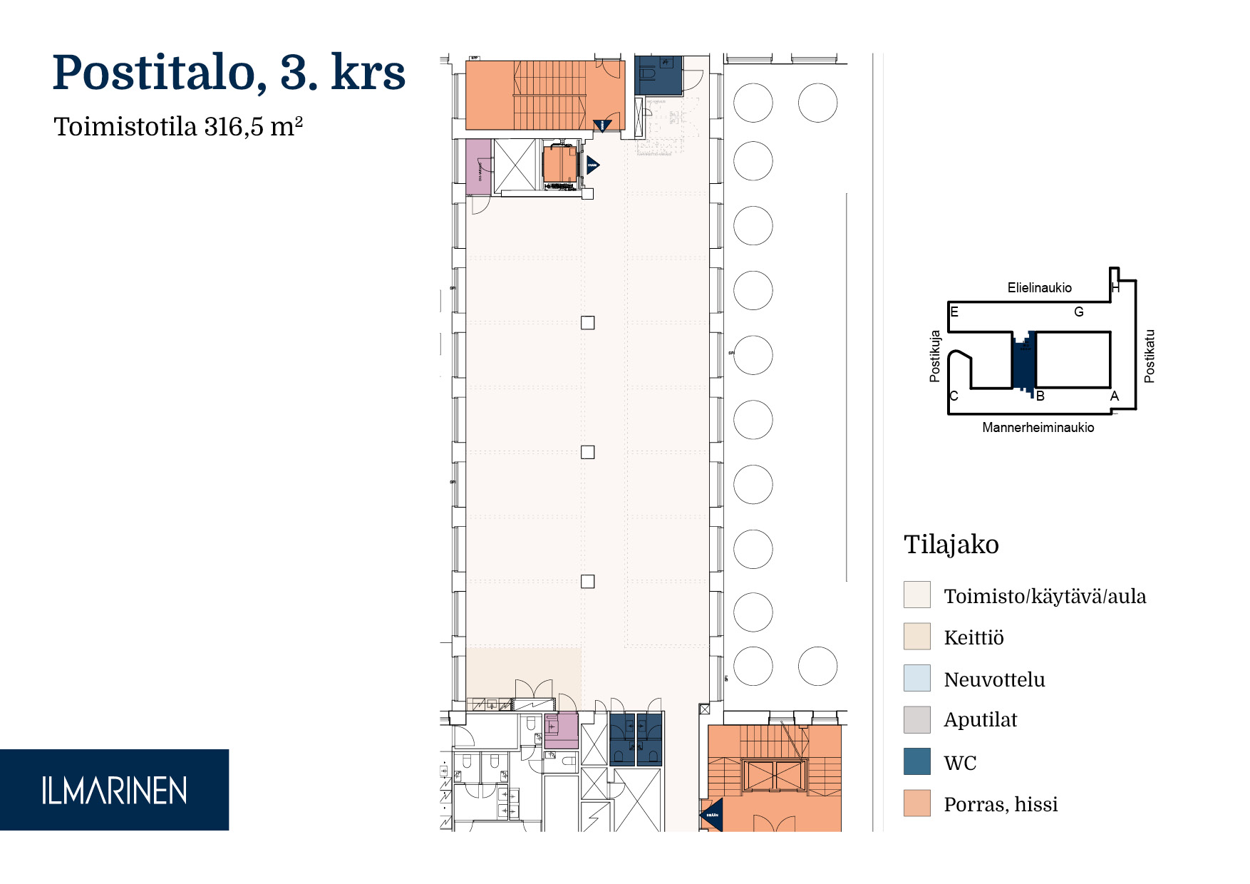 Kokonaan avointa tilaa. Mahdollisuus rakentaa neuvotteluhuoneita tai muita lisä- ja erillishuoneita. Pääsisäänkäynti B-portaasta, mutta tilaan pääsee myös D-portaan kautta, jossa myös suurempi tavarahissi rakennuksen sisäpihalle.