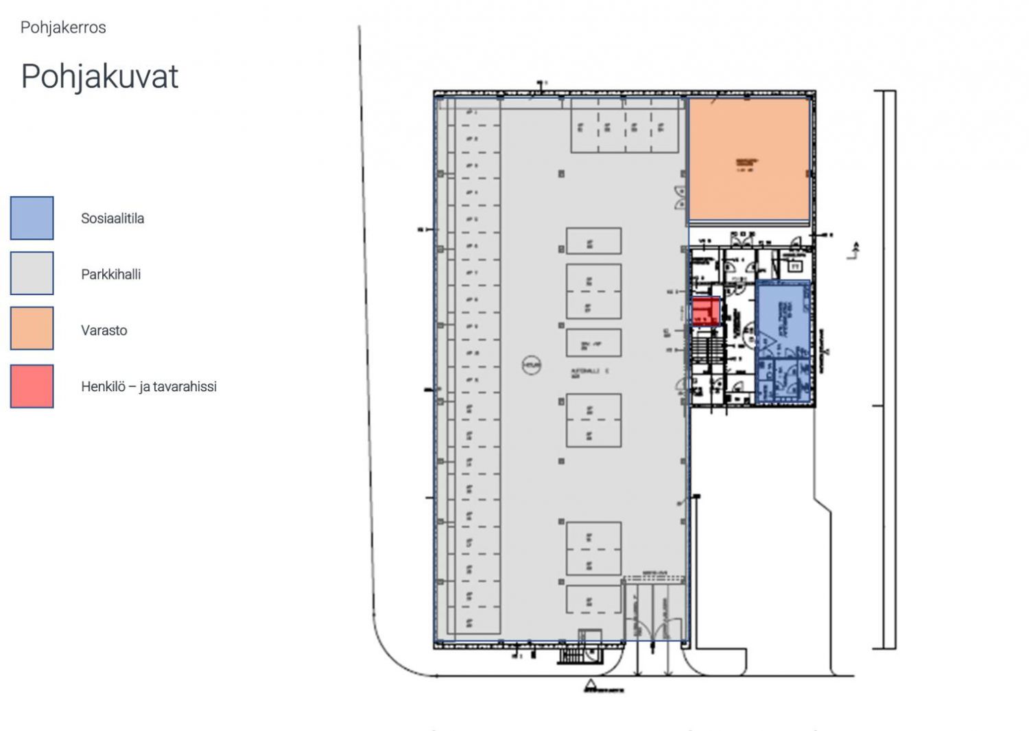 Yhteensä 38 autopaikkaa: hallissa 33, pihalla 5. Pohjakerroksen hallissa 32 merkittyä autopaikkaa.