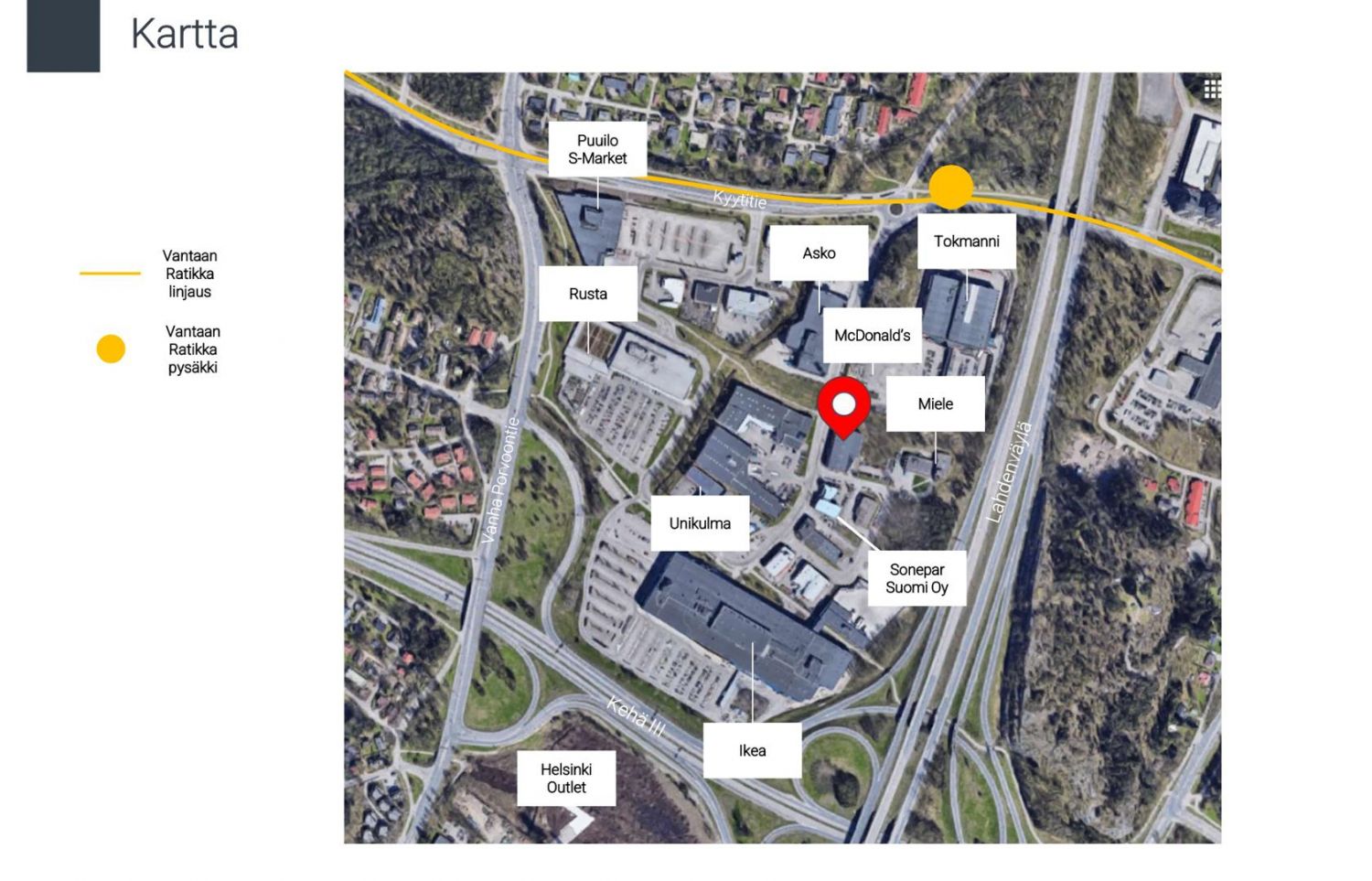 Sijainti Porttipuiston palveluiden keskellä tuo asiakasvirtaa: naapurustossa mm. IKEA, Helsinki Outlet, Tokmanni, Puuilo, Asko, Unikulma, S-Market ja McDonald’s. Lisäksi Vantaan raitiotien linjaus ja pysäkki ovat suunnitteilla alueelle.