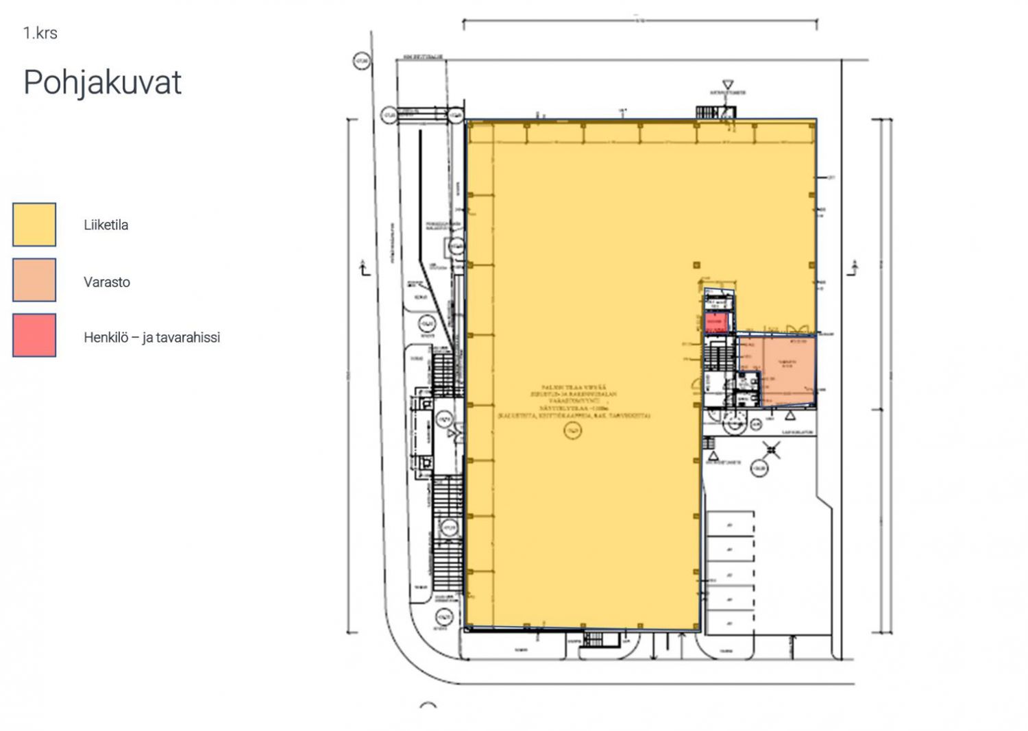 Rakenteet: seinä- ja kattorakenteet betonia, välipohjat ontelolaattaa; julkisivu lasi/tiili/Paroc-elementti; katemateriaali huopa.