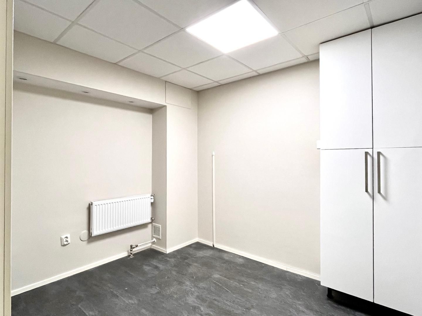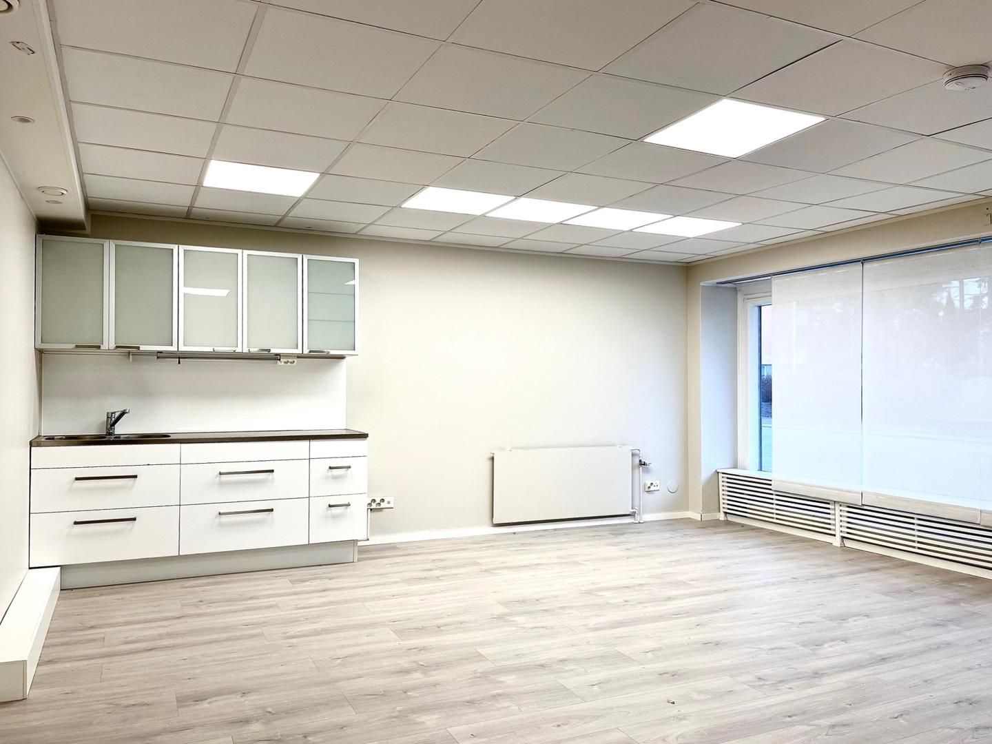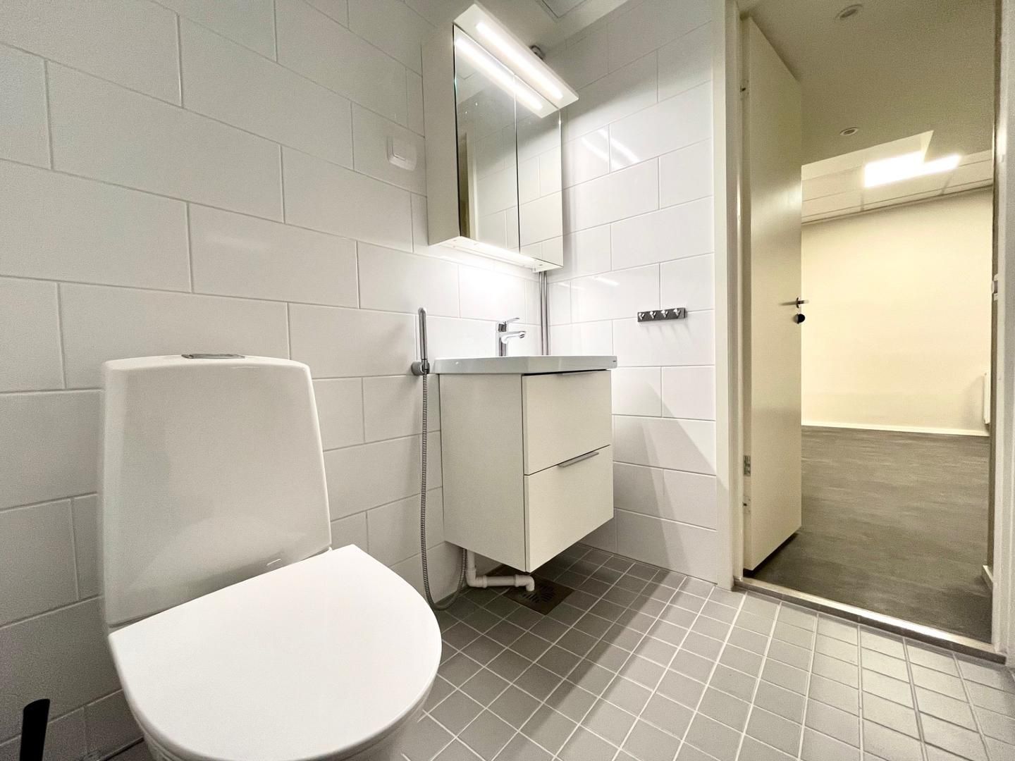 Tilassa on tuulikaappi, iso asiakastila vesipisteellä ja kaapistoilla, taaemmassa huoneessa keittiö jääkaapilla, kaksi vesipistettä, tilavaraus pyykinpesukoneelle sekä uloskäynti takapihalle ja WC-tilaan, joka on vaalea, laatoitettu ja uusittu putkiremontin yhteydessä. Lisäksi on pienempi huone, joka sopii esimerkiksi hoitohuoneeksi tai toimistoksi ja jossa on myös kaapisto.