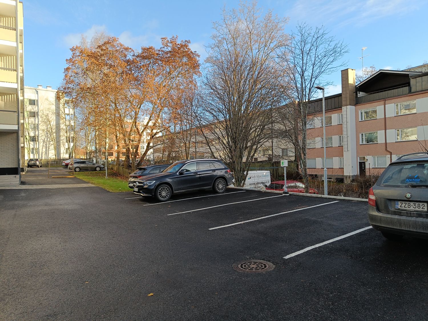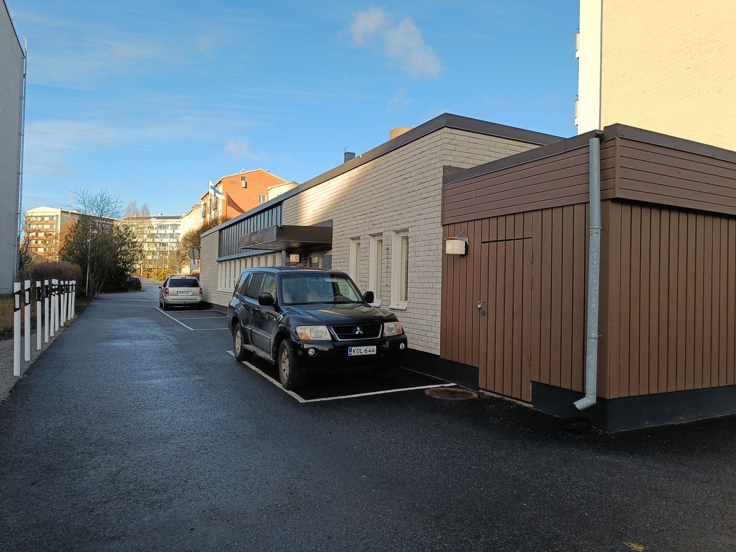 Paikkoja varattavissa ja pysäköintikiekkopaikkoja on tien toisella puolella runsaasti.
