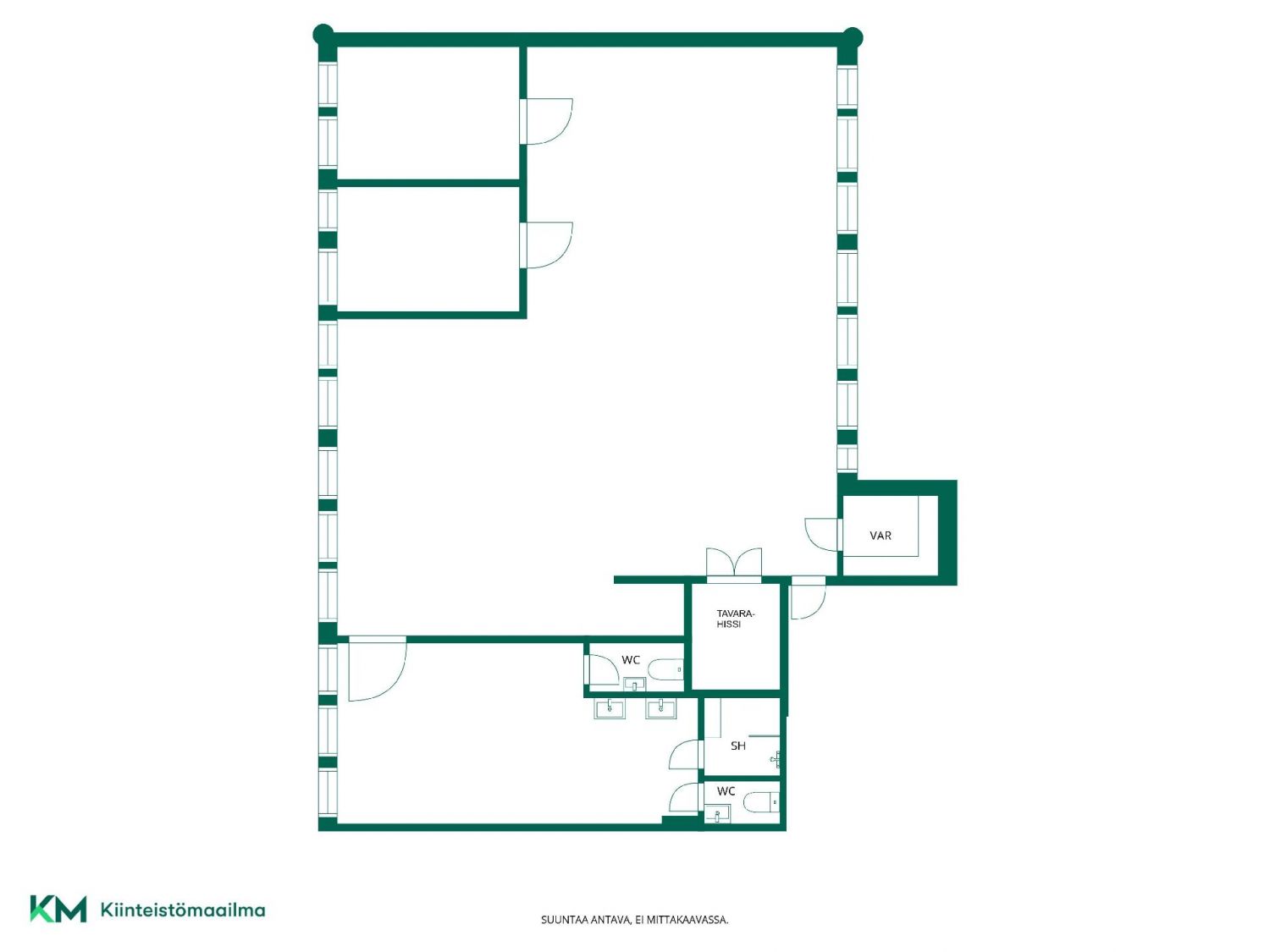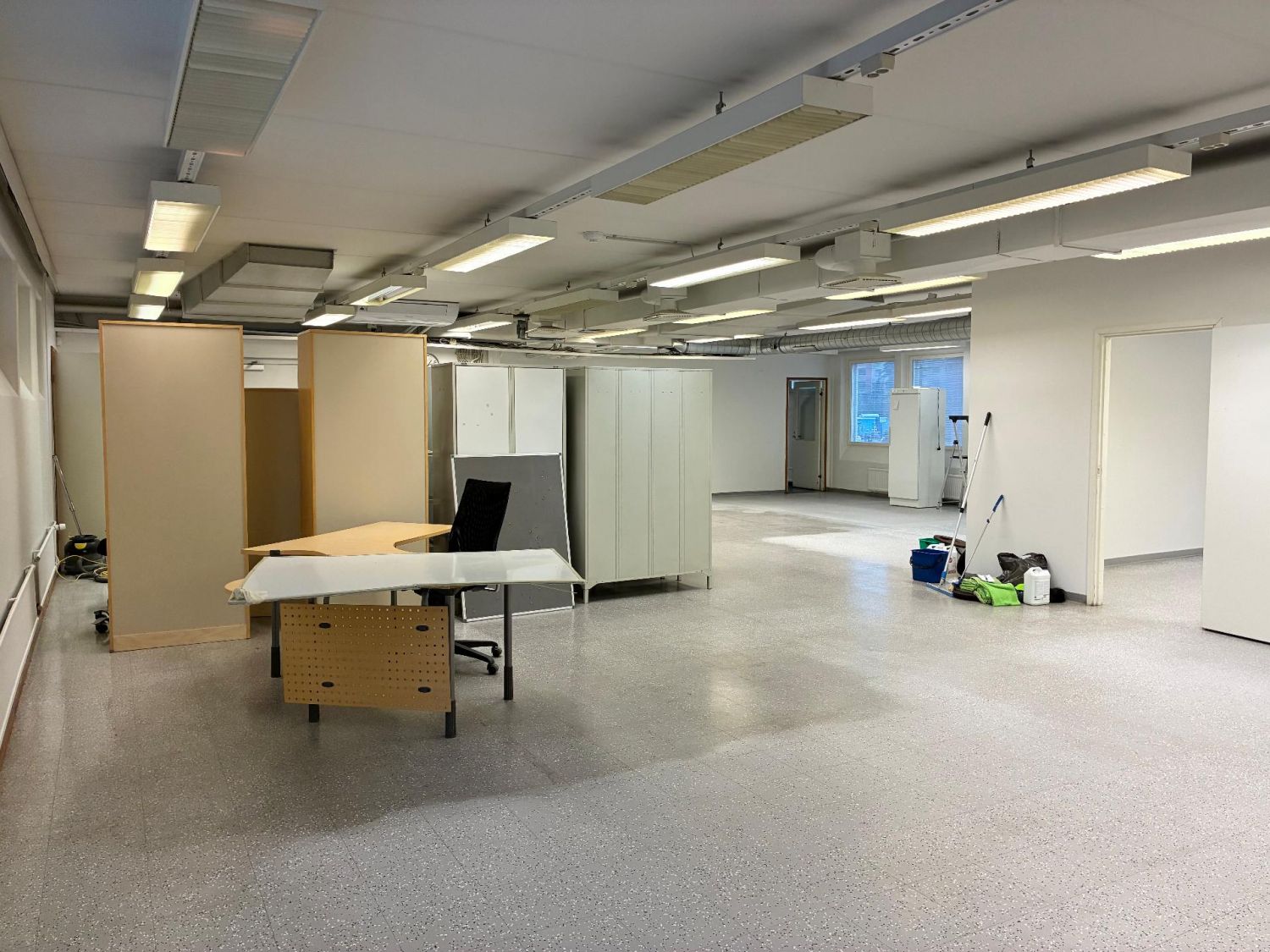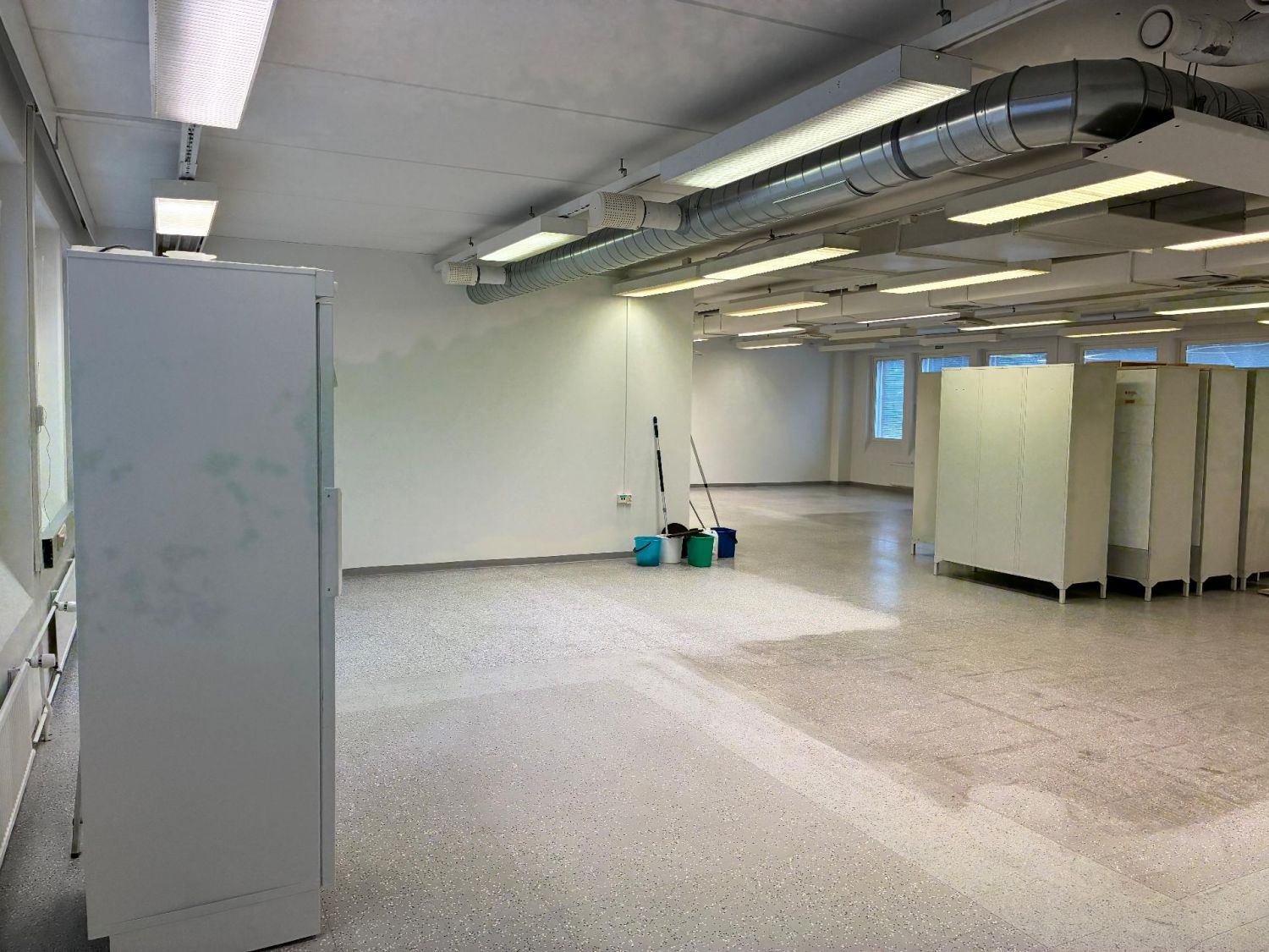 Tilassa on kaksi toimistohuonetta sekä iso avoin tila. Pohjaratkaisua on mahdollisuus muokata tarpeen mukaan. Lisäksi tilassa on tavarahissi, wc-tilat, suihku ja pukuhuone.