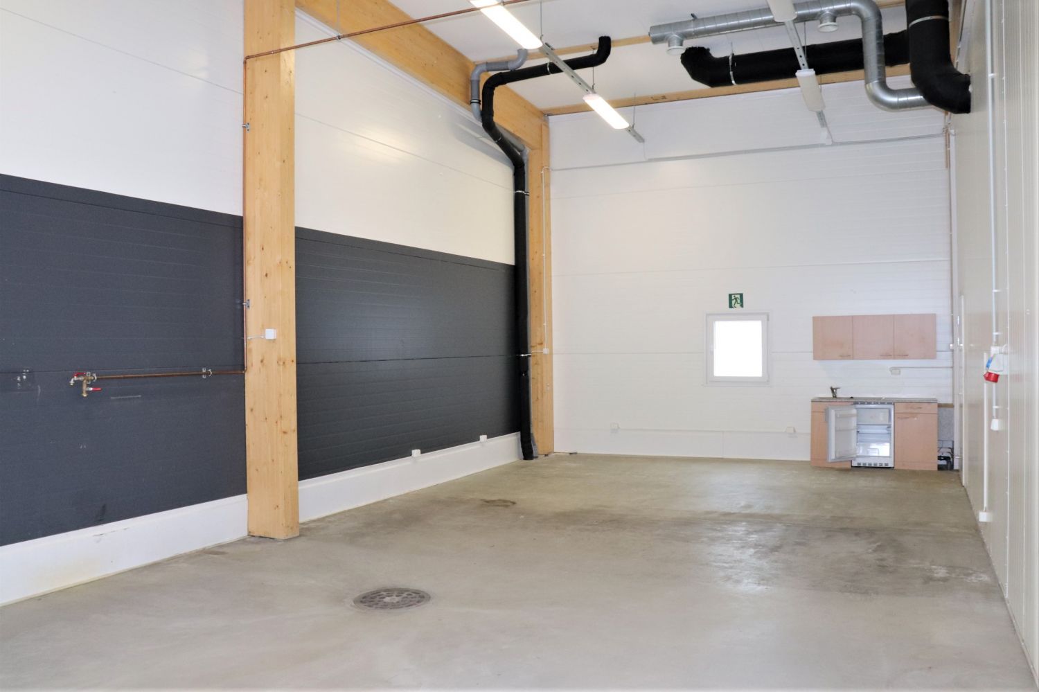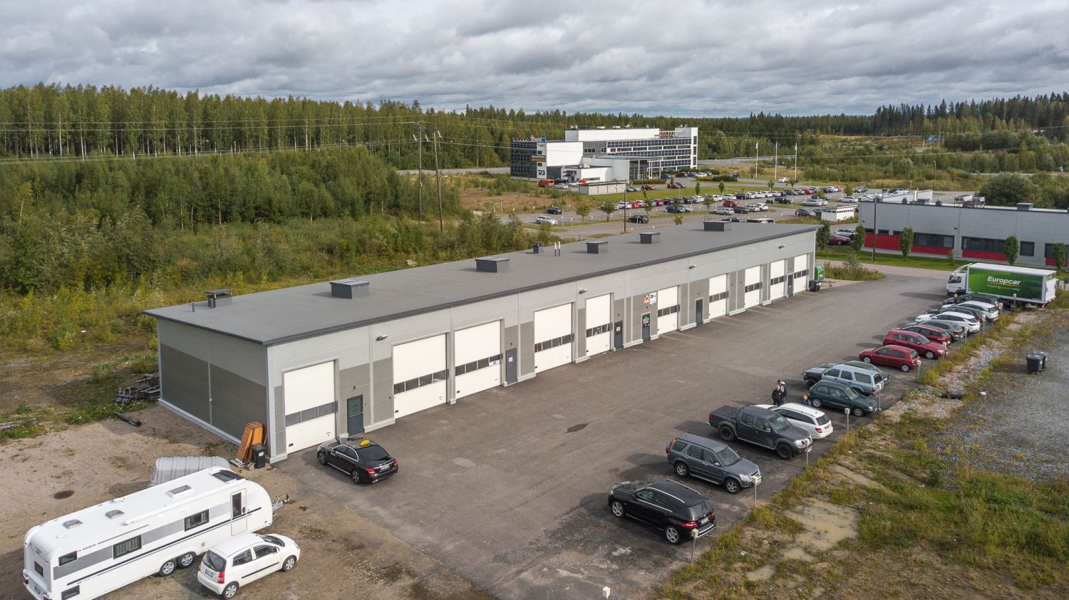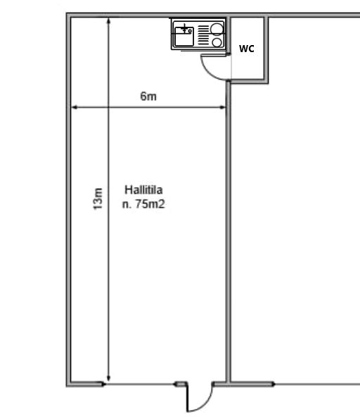Vuokrattava halli noin 13 x 6 metriä (pit x lev) rakennuksen päädyssä. Vapaa korkeus noin 5 metriä, tilaan nosto-ovi 3 x 4,5 metriä (l x k).