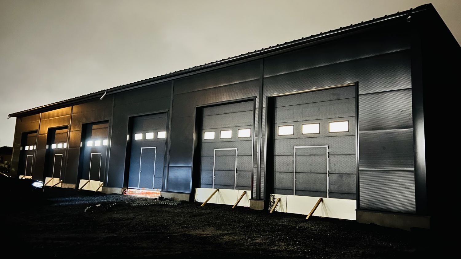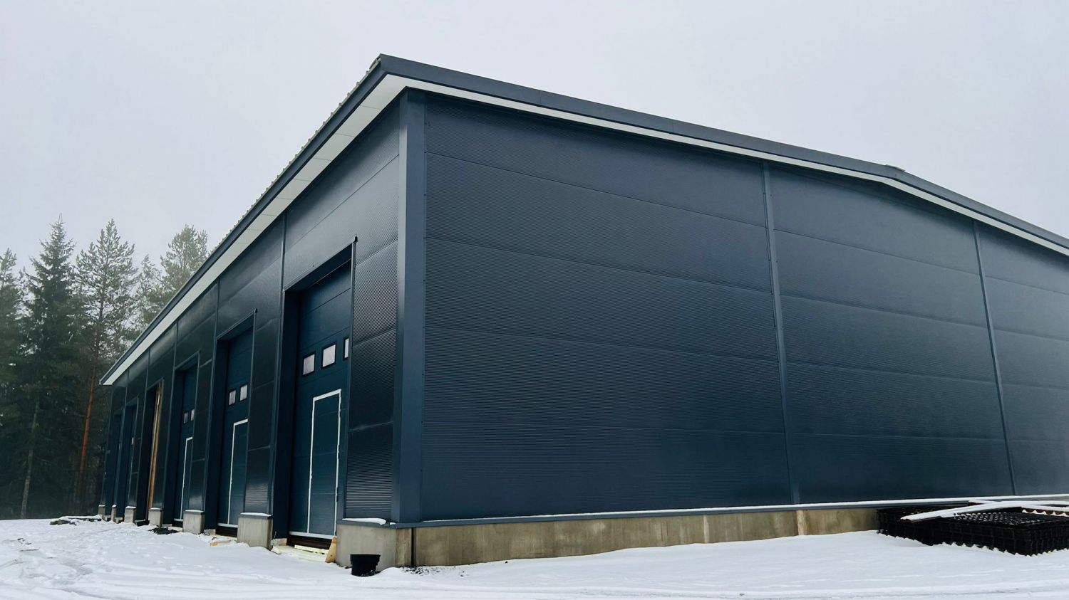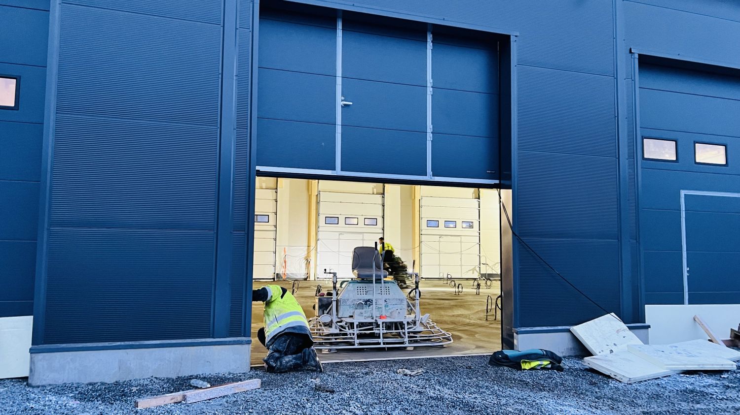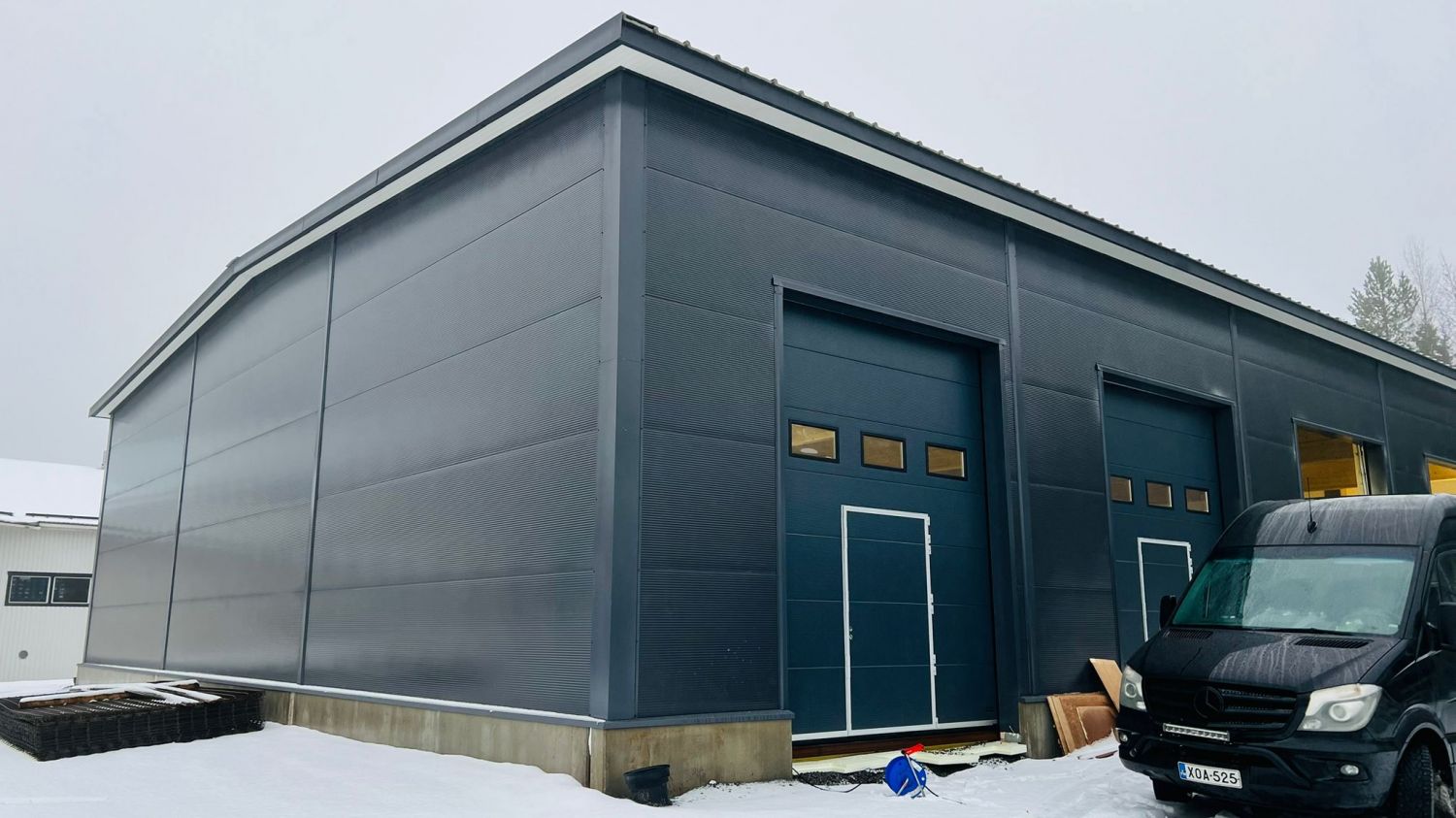 • Moottoroitu nosto-ovi n. 3,3 m (lev.) × 4,2 m (kork.), varustettu käyntiovella