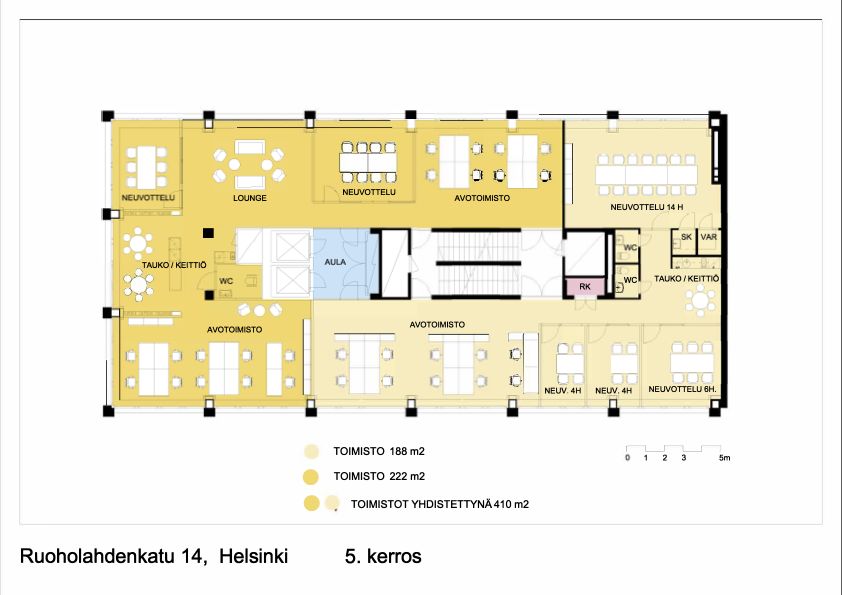 Ruoholahdenkatu 14 viidennen kerroksen toimistotiloista avautuvat upeat näkymät ihastuttaviin Ruoholahden villoihin, vehreään Lastenlehdon puistoon, viereiselle Abrahaminkadulle sekä korttelin avaralle sisäpihalle. Erityisesti kerroksen kulmista aukeaa kiehtovat kaupunkinäkymät kahteen suuntaan. Koko seinän levyisistä ikkunoista tulvii luonnonvaloa, ja alkuperäiset tiikkiset ikkunapenkit ja karmit tuovat tilaan lämpöä ja persoonallisuutta. Tilat on mahdollista yhdistää koko kerroksen laajuiseksi kokonaisuudeksi