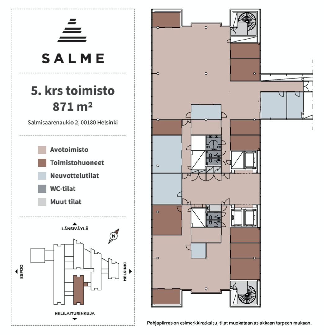 Salmen tilat ovat hyvässä kunnossa ja talotekniikka on nykyaikaista. Muuntojoustaviin tiloihin voidaan toteuttaa monitoimi-, avo- tai kombitoimistotilaa, lisäksi kerroksissa taukotilat ja kokoushuoneet.