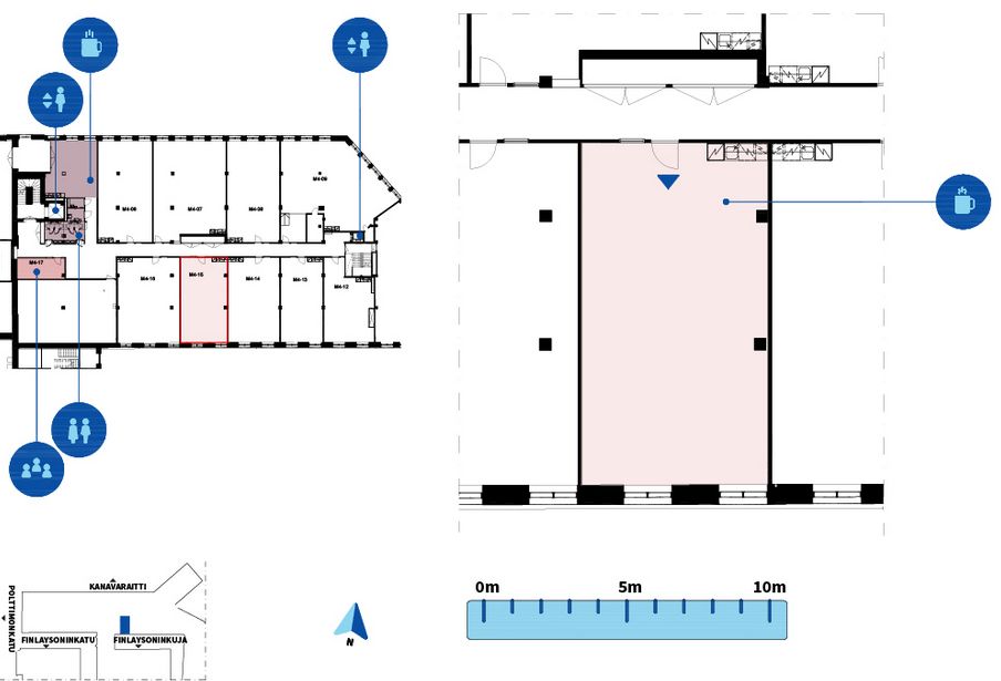 Avotoimistotila, jossa oma minikeittiösyvennys. Vuokralaisten yhteiskäytössä on varaustilanne huomioiden ilman erillisveloitusta 3. ja 4. kerroksessa sijaitsevat neuvottelutilat sekä taukokeittiö ja wc-tilat.