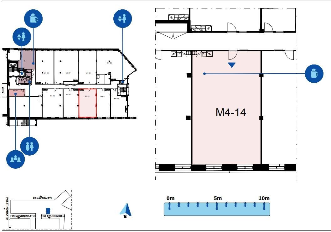 Avotoimistotila, jossa oma minikeittiönurkkaus. Vuokralaisten yhteiskäytössä on varaustilanne huomioiden ilman erillisveloitusta 3. ja 4. kerroksessa sijaitsevat neuvottelutilat sekä taukokeittiö ja wc-tilat.