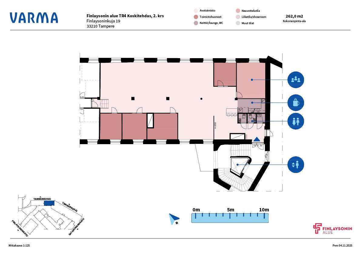 Perinteikäs Finlaysonin alue on vireä liike-elämän, vapaa-ajan ja kulttuuritapahtumien keskus, jossa toimivissa yli 100 yrityksessä työskentelee ja asioi päivittäin tuhansia ihmisiä. Alueen useat ravintolat ja kahvilat mahdollistavat maukkaat lounas- ja kahvihetket. Finlaysonin alueen vanhat tehdasrakennukset tarjoavat yrityksellesi uniikin toimintaympäristön Tammerkosken maisemissa. Finlaysonin alue on helposti saavutettavissa omalla autolla, julkisin kulkuvälinein ja kevyellä liikenteellä. Keskustori ja rautatieasema ovat kävelymatkan etäisyydellä. Tässä toimistotilassa on runsaasti ikkunoita kahteen suuntaan ja upeat koskimaisemat. Tilassa on oma taukokeittiö, neuvotteluhuone ja muutama työhuone sekä avotilaa. Kulku tiloihin hissillä tai portaita pitkin.