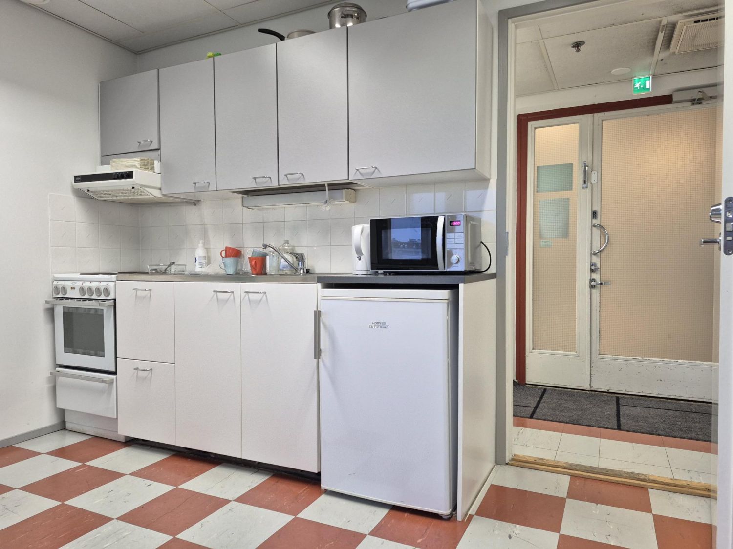 Kerroksessa kaksi vessaa ja keittiö, jotka yhteiskäytössä kaikille kerroksen käyttäjille.