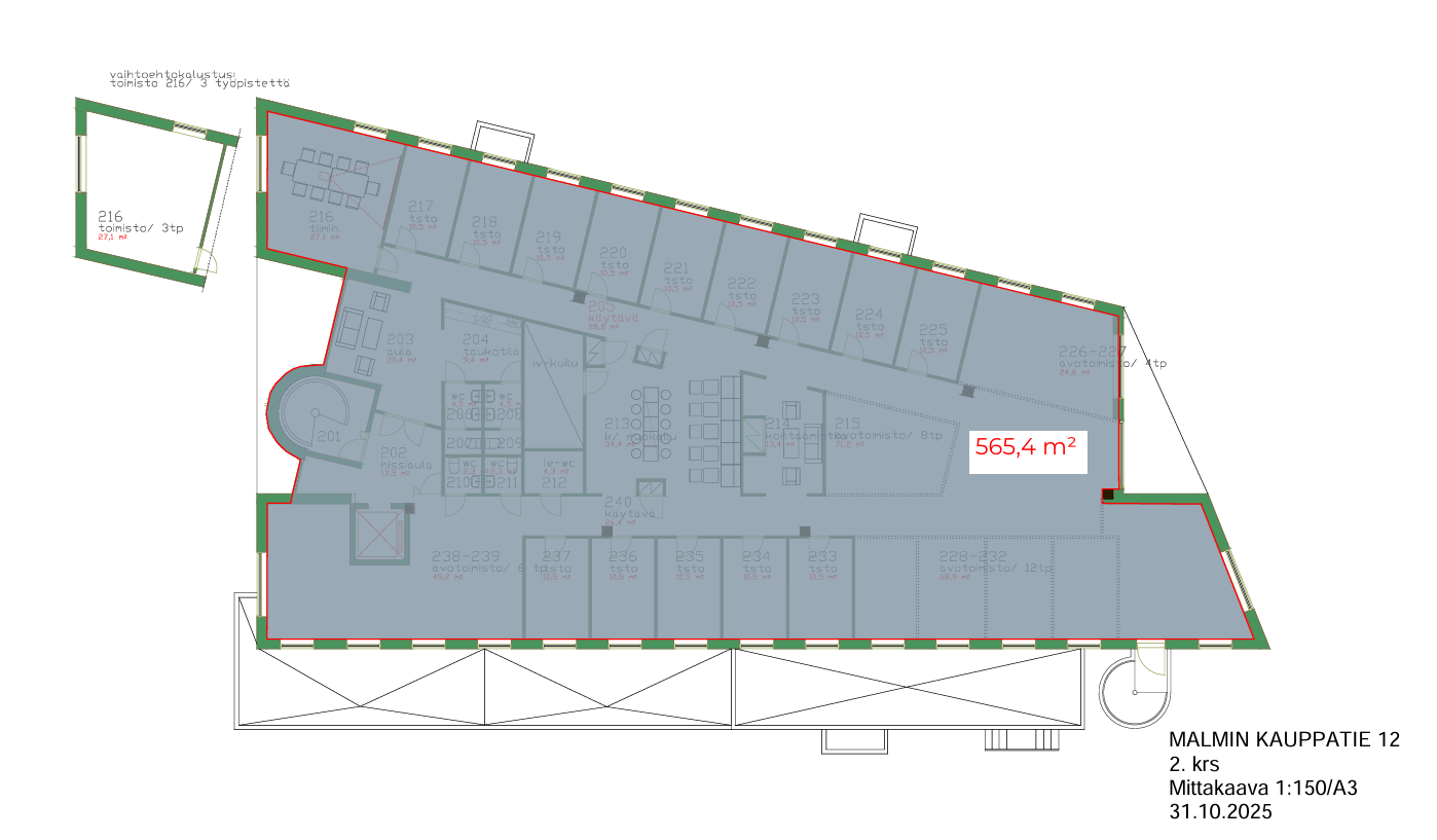 Vuokrattavana toisen kerroksen 565,4 m²:n toimistokokonaisuus, joka tarjoaa joustavat mahdollisuudet yrityksesi tarpeisiin. Tila on jaettavissa omien toimintamallien mukaan ja sisältää sekä huonetoimistoja että avaraa avotilaa. Käytössäsi on viihtyisät keittiö-, sosiaali- ja taukotilat, jotka tekevät arjesta sujuvaa ja miellyttävää.
