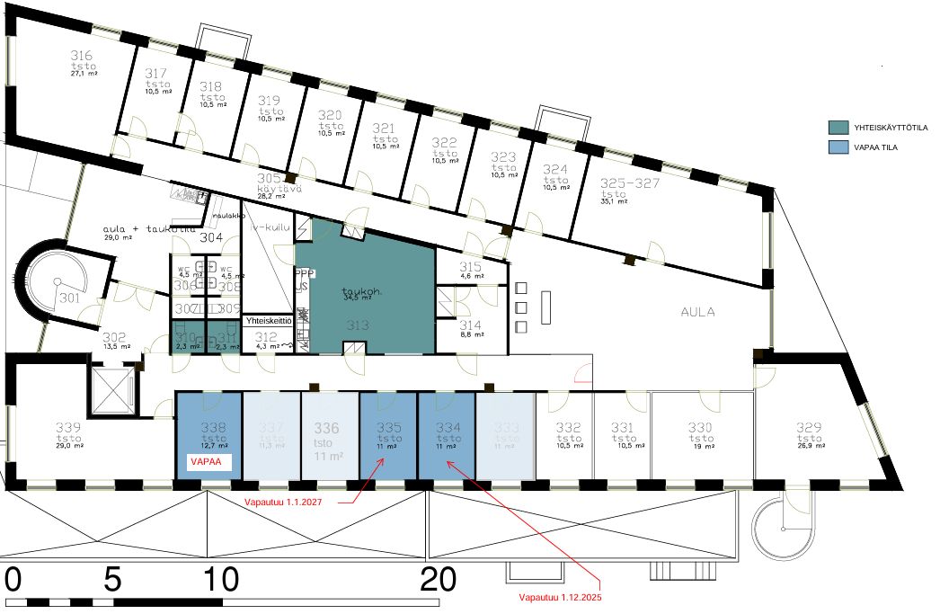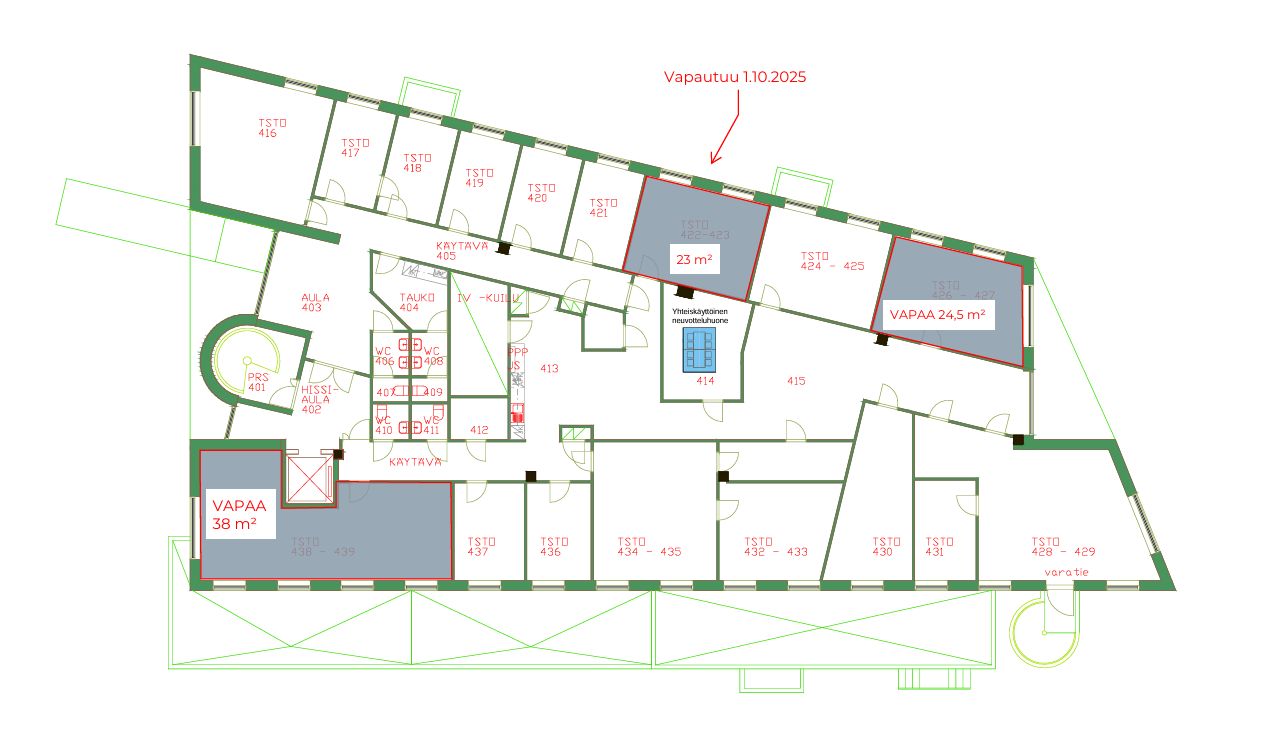 Vuokraan sisältyy yhteiskäyttöiset keittiö-, neuvottelu- ja wc-tilat