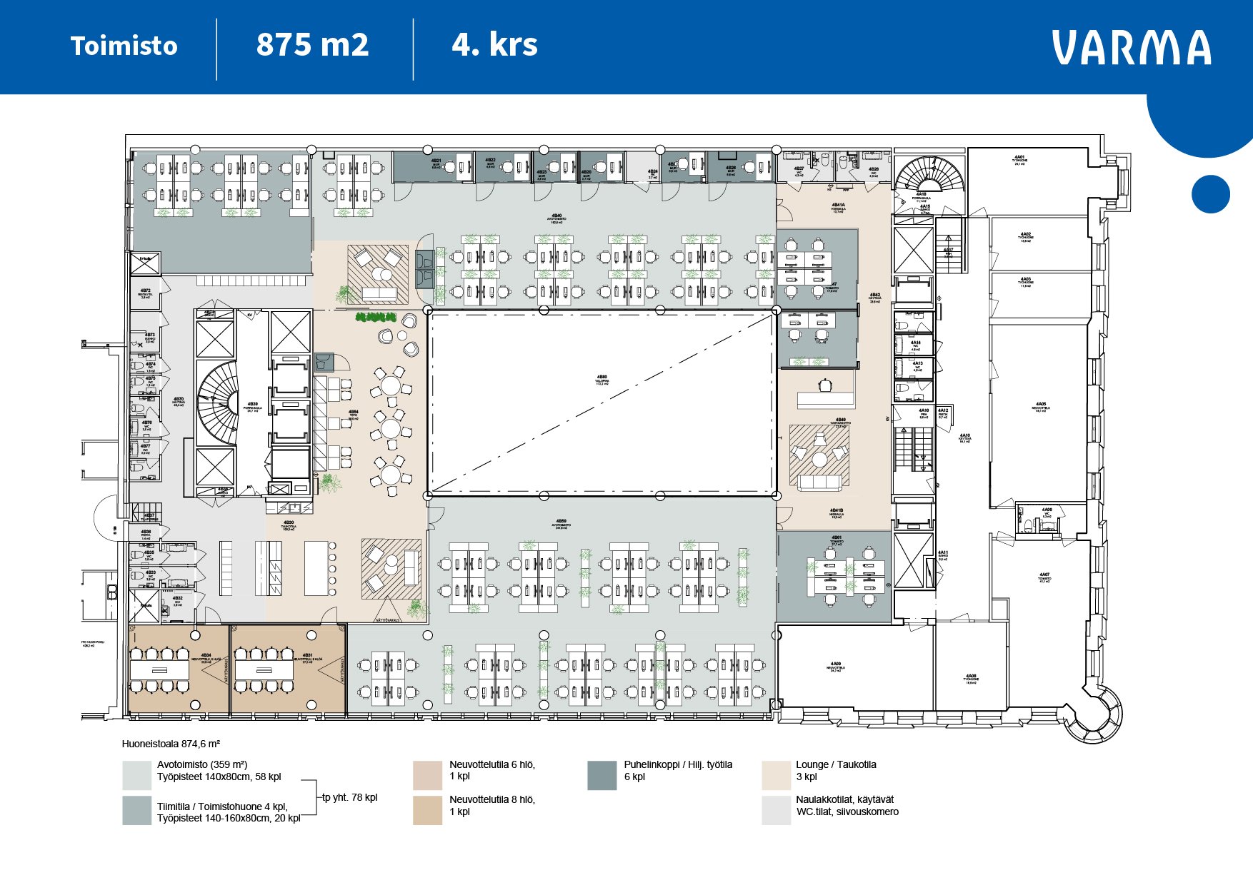Kohteen projektivuokrausta hoitaa JLL Finland: Terhi Kivekäs, 050 365 8603, terhi.kivekas@jll.com / Pekka Issakainen, 050 390 0090, pekka.issakainen@jll.com. Neljännen kerroksen toimistotilasta on näkymät kiinteistön valopihalle ja Fabianinkadun suuntaan. Monitilatoimisto koostuu avoimesta työtilasta, neuvotteluhuoneista, työhuoneista ja puhelinkopeista. Viihtyisät loungetilat tarjoavat puitteet yhteisöllisille tauoille.