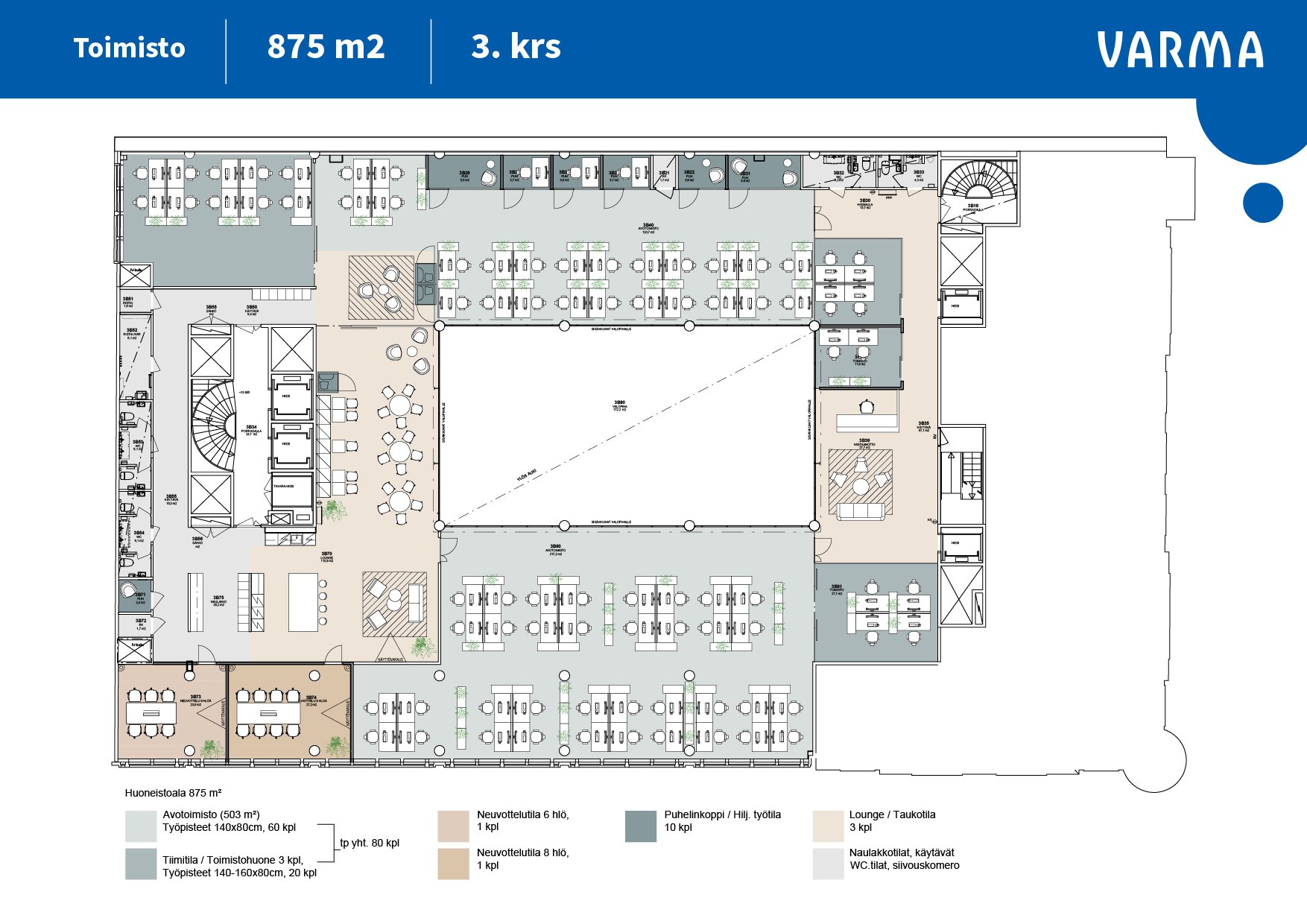 Kohteen projektivuokrausta hoitaa JLL Finland: Terhi Kivekäs, 050 365 8603, terhi.kivekas@jll.com / Pekka Issakainen, 050 390 0090, pekka.issakainen@jll.com. Kolmannen kerroksen toimistotilasta on näkymät kiinteistön valopihalle ja Fabianinkadun suuntaan. Nykyaikainen monitilatoimisto koostuu avotyötiloista, neuvotteluhuoneista, työhuoneista ja puhelinkopeista. Viihtyisät loungetilat tarjoavat puitteet yhteisöllisiin taukohetkiin.