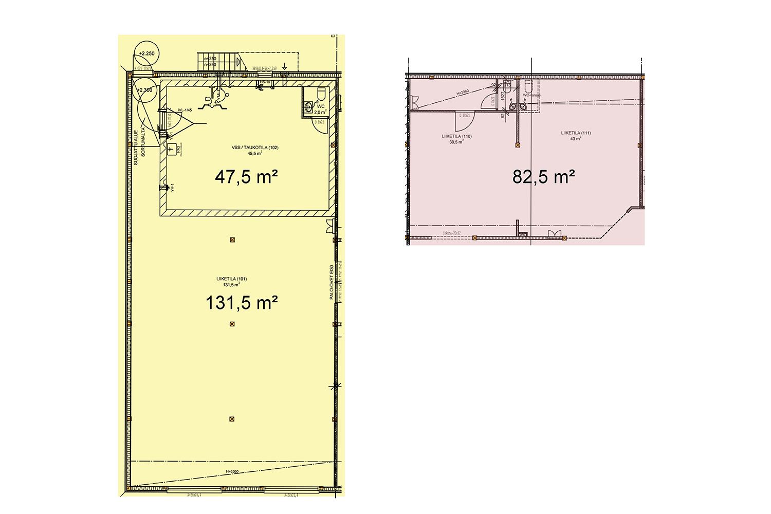 Pienemmän liiketilan pinta-ala on 82,5 m² ja siellä on lisäksi kaksi WC ja yksi taukohuone.
